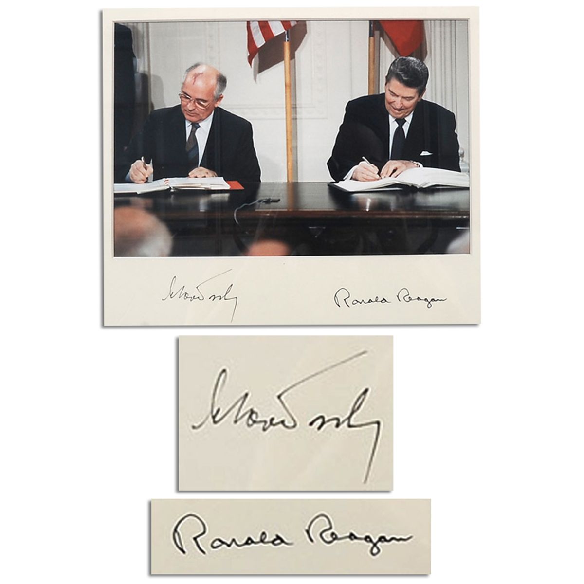 Signed glossy photo of Ronald Reagan and Mikhail Gorbachev signing the Intermediate-Range Nuclear Forces Treaty on 8 December 1987. It was taken in the East Room of the White House. Reagan as U.S. President and Gorbachev as General Secretary of the Soviet Union signed the mat that surrounds the 6.25'' x 9.5'' photo in black ink: ''M Gorbachev'' and ''Ronald Reagan''. Framed to overall size of 17.25'' x 15.5''.