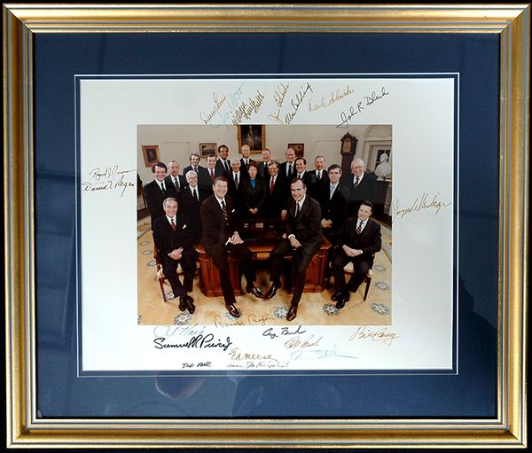 Reagan, Ronald (1911-2004) 40th President of the United States (1981-1989). Official White House color photograph of President Reagan's Cabinet in 1981, signed by President Reagan, Vice President Bush, and each of the 18 Cabinet members. The photograph was matted and framed by the White House frame shop to an overall size of 19¼ x 16½ in.