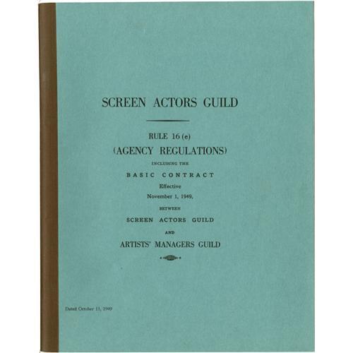 <B>Ronald Reagan Signed Screen Actors Guild Regulations and Basic Contract.</B></I> "<I>Ronald Reagan.</B></I>" 54 pages, 8.5" x 10.75", California, October 15, 1949. This is a full copy of the <I>Screen Actors Guild Rule 16e (Agency Regulations) Including the Basic Contract Effective November 1, 1949, Between Screen Actors Guild and Artists' Mangers Guild.</B></I> Reagan served as President of the Screen Actors Guild from 1947 to 1952 and again from 1959 to 1960. Reagan's signature appears on page 54. The document is in extra fine condition; like new.