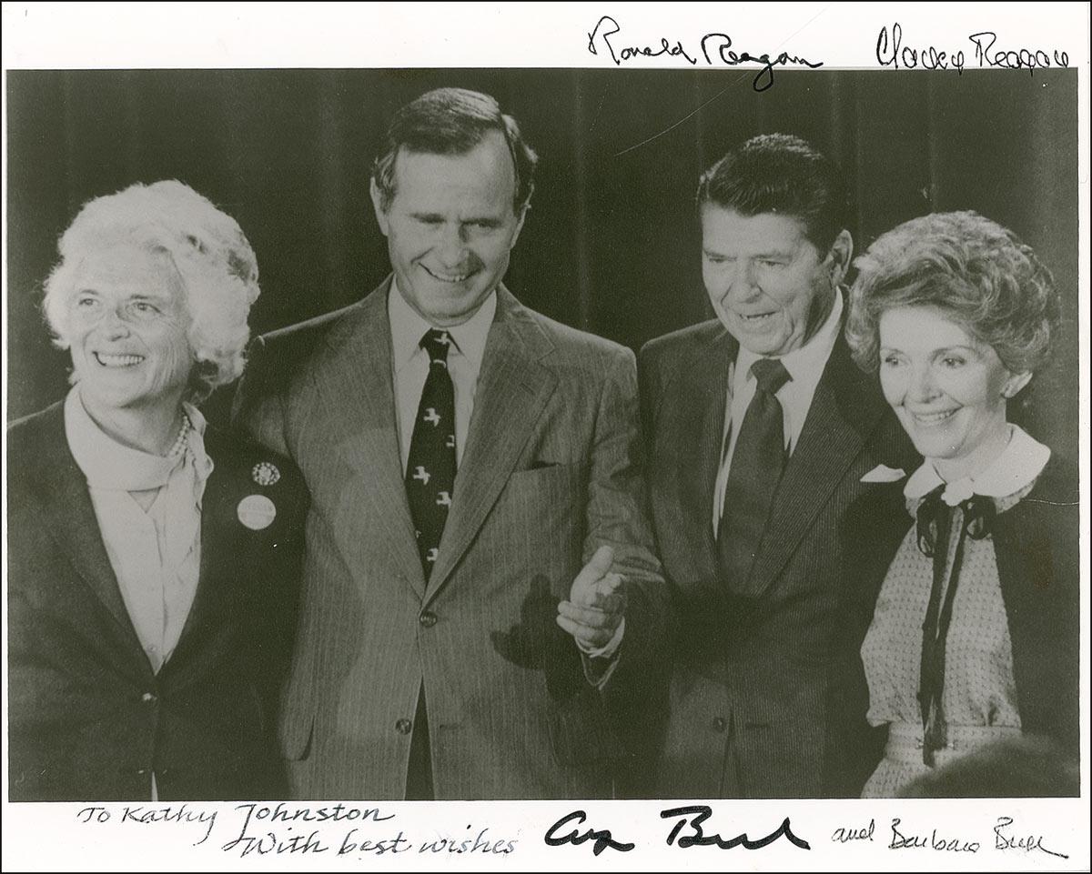 Satin-finish 10 x 8 photo of the Reagans and Bushs posing together, signed and inscribed in a calligrapher’s hand “To Kathy Johnston, With best wishes,” and signed at the top in black felt tip by Ronald and Nancy Reagan, and signed at the bottom in black felt tip by George Bush and in black ink by Barbara Bush. In fine condition, with a couple light brushes to inscription and last name of Barbara’s signature, and a couple of light surface creases.