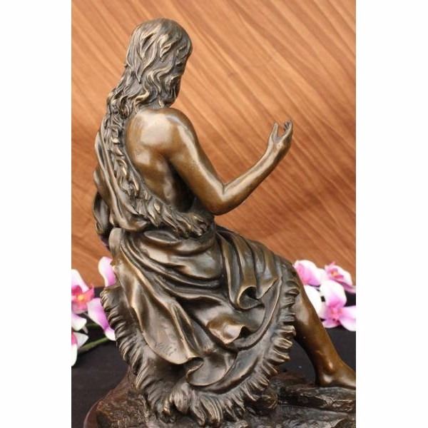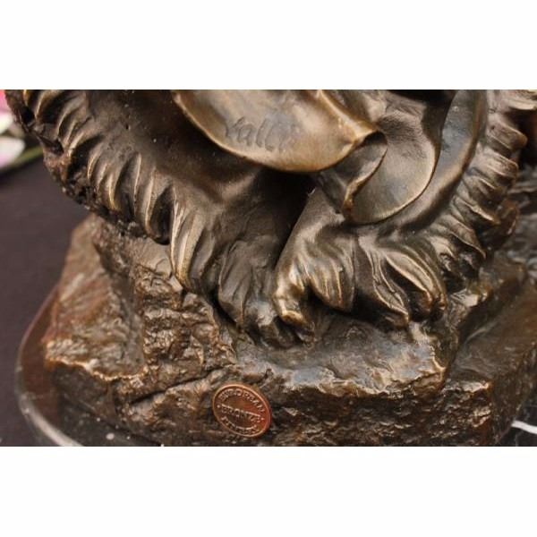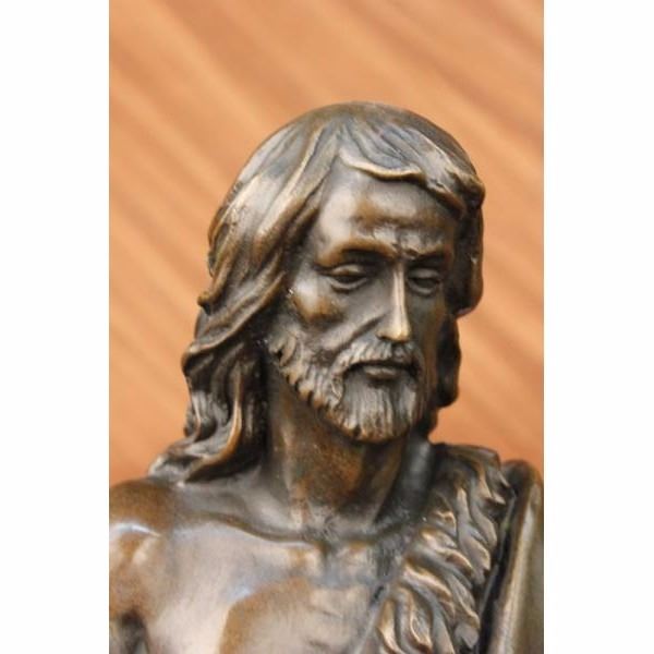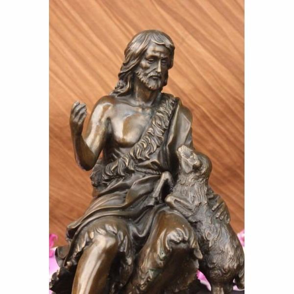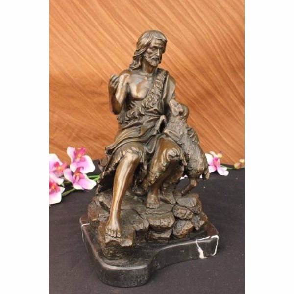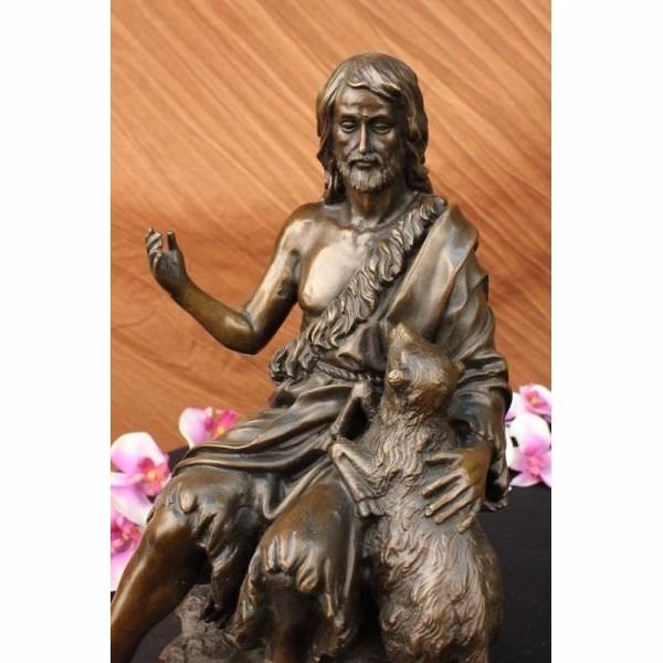 Jesus Christ sits on a rock entwined by a long flowing robe. He raises his hand like an antenna gathering everything in and out of his divine soul. With eyes slightly closed, he seems to take a deep breath inward, gaining his peace, that he will bestow to the world in infinite blessings. He has this sheep at his side and he is trying to climb on his lap but decided to just rest his leg on his thighs.The bronze handmade sculpture was cast using the ancient method of lost-wax casting and stained with a brown patina finish for preservation. It is mounted upon a black variegated marble base with the the artist Valli's signature Condition: This sculpture is in perfect condition. Bronze Dimensions with Marble Base:Height 14" x Width 8" Marble Dimensions: Diameter 8" Height without base: 13 " Weight :18 LBS Inventory : 31-Y0997613