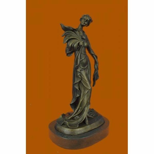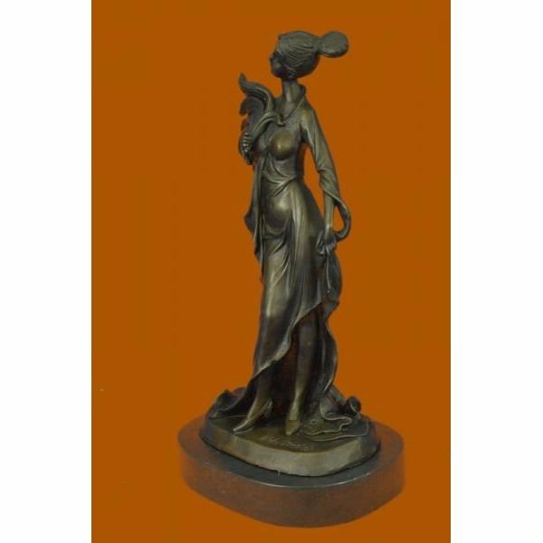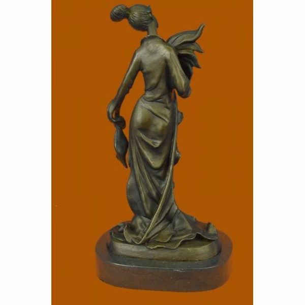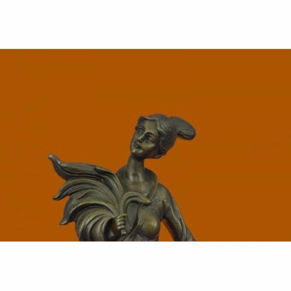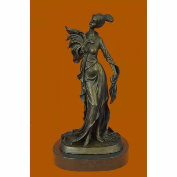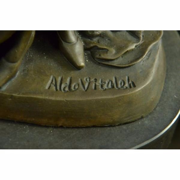 The young woman can be imagined walking around her garden in the early morning sunlight exercising her green thumb. Her beautiful dress wraps around her, pulled back by the wind, as her eyes face the ground under her over-sized feather she is holding on her right hand. She was cast using the ancient method of lost-wax casting and stained with a brown patina finish for preservation. She is mounted upon a black marble base and is signed by artist Aldo Vitaleh. Condition: This sculpture is in perfect condition. Bronze Dimensions with Marble Base:Height 13" x Width 7" Marble Dimensions: Diameter 7". Height without base: 12" Weight : 9 LBS Inventory : 79YRD12704537