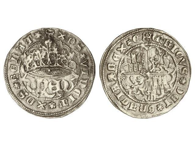 Real. ENRIQUE IV. SEGOVIA. Anv.: ¶XPS*VINCIT*XPS*RENAT*. HEN coronadas. Rev.: ¶ENRICVS*DEI*GRACIA*REX*C. Acueducto en extremo inferior del eje vertical. (Pequeñas oxidaciones. Rayitas). FAB-712. MBC.