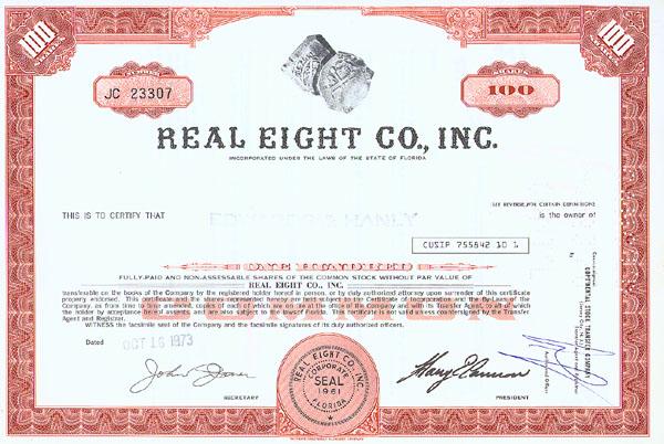 1973, Florida. Stock certificate for 100 shares. Brown/Black. Small vignette at top center. Perferation cancelled. Very fine.