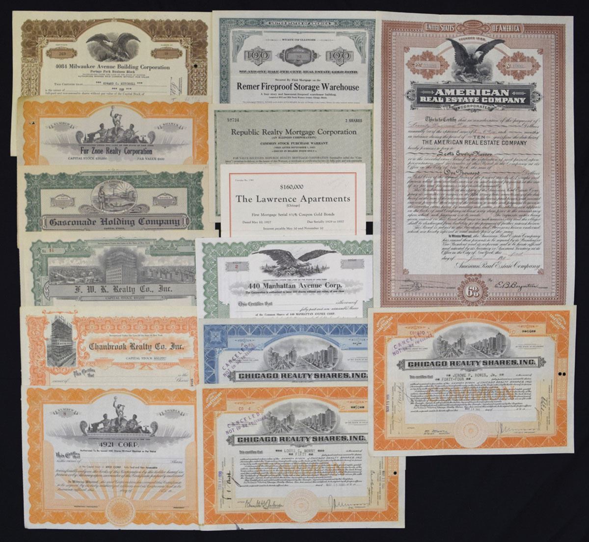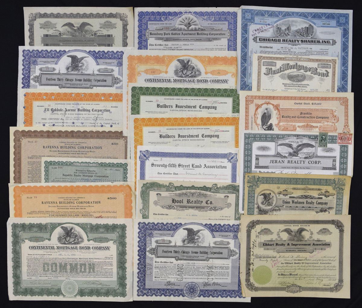 Various States, ca.1900-40s. Lot of 30+ I/U and I/C Stock and Bond Certificates relating to real estate, mortgage, land development, apartment financing, and construction companies. Attractive and diverse group with engraved buildings, allegorical figures, and eagle vignettes. Includes Continental Mortgage Bond Co.; Builders Investment Co.; Chicago Realty Shares Inc.; First Mortgage Land Co.; Franklin Realty & Construction Co.; Jeran Realty Corp.; Union Workmen Realty Co.; Elkhart Realty & Improvement Assn.; Remer Fireproof Storage Warehouse; American Real Estate Co.; Guzornade Holding Co.; Ravenna Building Corp.; 431 Oakdale Avenue Building Corp.; 4041 Milwaukee Avenue Building Corp.; 75th Street Land Assn.; Yool Realty Co.; Manhattan Avenue Corp.; The Lawrence Apartments bond; 1921 Corp.; Chanbrook Realty Co.; and others. Conditions range from VF to AU, with typical folds, toning, and handling. (30+). Sold ‘AS IS’ no returns accepted.