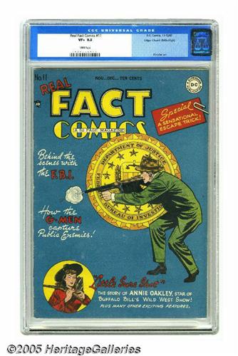 <B>Real Fact Comics #11 Mile High pedigree (DC, 1947) CGC VF+ 8.5 White pages.</B></I> Annie Oakley and FBI features. Everett Raymond Kinstler art. Overstreet 2005 VF 8.0 value = $89; VF/NM 9.0 value = $127. CGC census 6/05: 3 in 8.5, none higher.