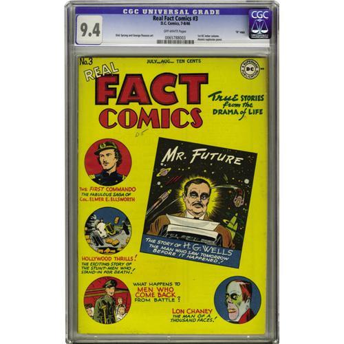 <B>Real Fact Comics #3 "D" Copy pedigree (DC, 1946) CGC NM 9.4 Off-white pages.</B></I> According to Overstreet, this book has the first letter column in a DC comic! Fandom would never be the same. It also has features on H. G. Wells and Lon Chaney. Overstreet 2006 NM- 9.2 value = $415. CGC census 03/06: 1 in 9.4, 1 higher.