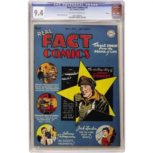 <B>Real Fact Comics #4 "D" Copy pedigree (DC, 1946) CGC NM 9.4 Off-white to white pages.</B></I> This issue has the very first comic book art by pulp legend Virgil Finlay! Actor Jimmy Stewart, writer Jack London, and the radio game show "Truth Or Consequences" are among the topics covered in this issue. Overstreet 2007 NM- 9.2 value = $465. CGC census 6/07: 1 in 9.4, 1 higher.<BR><BR><b>Shipping:</b> Comics - Slabbed (certified) (<a target="_blank" href="http://www.heritageauctions.com/common/shipping.php">view shipping information</a>)