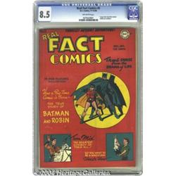 <B>Real Fact Comics #5 (DC, 1946) CGC VF+ 8.5 Off-white pages.</B></I> This is the most sought after book of this title's run because it includes a story about the creation of Batman and Robin (the title didn't have superhero fare otherwise). Tom Mix appears in one of the book's other features. According to CGC's census, only two copies of this issue have been certified with higher grades as of this writing. Overstreet 2004 VF 8.0 value = $1,150; VF/NM 9.0 value = $1,725. <BR><BR><B>Important notice:</B> Heritage usually auctions material at the rate of 200-250 lots per hour. On some occasions eBay Live bid software or the Internet may not be able to keep up with the pace of the auction. We recommend placing a realistic absentee bid now as insurance to avoid disappointment. Occasionally the auctioneer may eliminate or reject an eBay Live bid, and the auctioneer may also reopen a lot after the close of the eBay live bidding (usually because we missed an audience bid), and may reject your bid even if it shows you as the winning bidder. By bidding via eBay Live, you agree that Heritage may award the lot to another bidder at its sole discretion under the circumstances described above or any other reasonable circumstances. Since eBay bids are not shown to us until we open the lot on the floor, we treat those bids just like floor bids. In most cases the floor responds before the eBay bid is presented to us, due to Internet lag time, so for consistency we have made it a policy that floor bids are always considered first over tie eBay live bids. Also please note that all Heritage lots purchased through eBay Live carry a 20% Buyer's Premium. Please make sure you read the Terms and Conditions before you bid. </span></font></tr></table></td></tr></table>