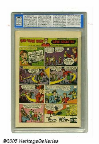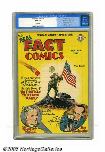 <B>Real Fact Comics #6 Mile High pedigree (DC, 1947) CGC NM 9.4 White pages.</B></I> Believe it or not, this collection of (mostly) nonfiction stories features the first appearance of Tommy Tomorrow! Tommy is used here as a nondescript Everyman of the future, but in time he became a science fiction adventurer in the back pages of <B>Action Comics</B></I> as well as his own issues of <B>Showcase</B></I>. Interestingly, the letters page has the first published words of Harlan Ellison (who was still in his early teens at the time). There's also art in the issue by ace pulp illustrator Virgil Finlay. The flag cover is also worthy of mention, since the flag in question is being planted on Mars! Overstreet 2005 NM- 9.2 value = $1,475. CGC census 2/05: 1 in 9.4, none higher.