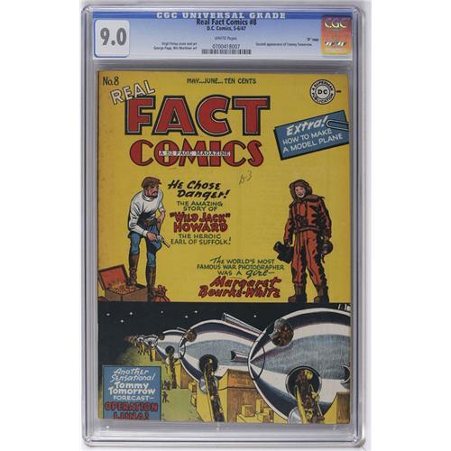 <B>Real Fact Comics #8 "D" Copy pedigree (DC, 1947) CGC VF/NM 9.0 White pages.</B></I> This issue's mix of features includes the second appearance of Tommy Tomorrow (from back when he was used as an "average Joe of the future" character). It's also got a feature on Margaret Bourke-White (with the then 43-year-old photographer being called a "girl" on the cover) and much more. Virgil Finlay drew the cover as well as contributing interior art. Overstreet 2006 VF/NM 9.0 value = $622; NM- 9.2 value = $850. CGC census 3/06: 1 in 9.0, 1 higher.