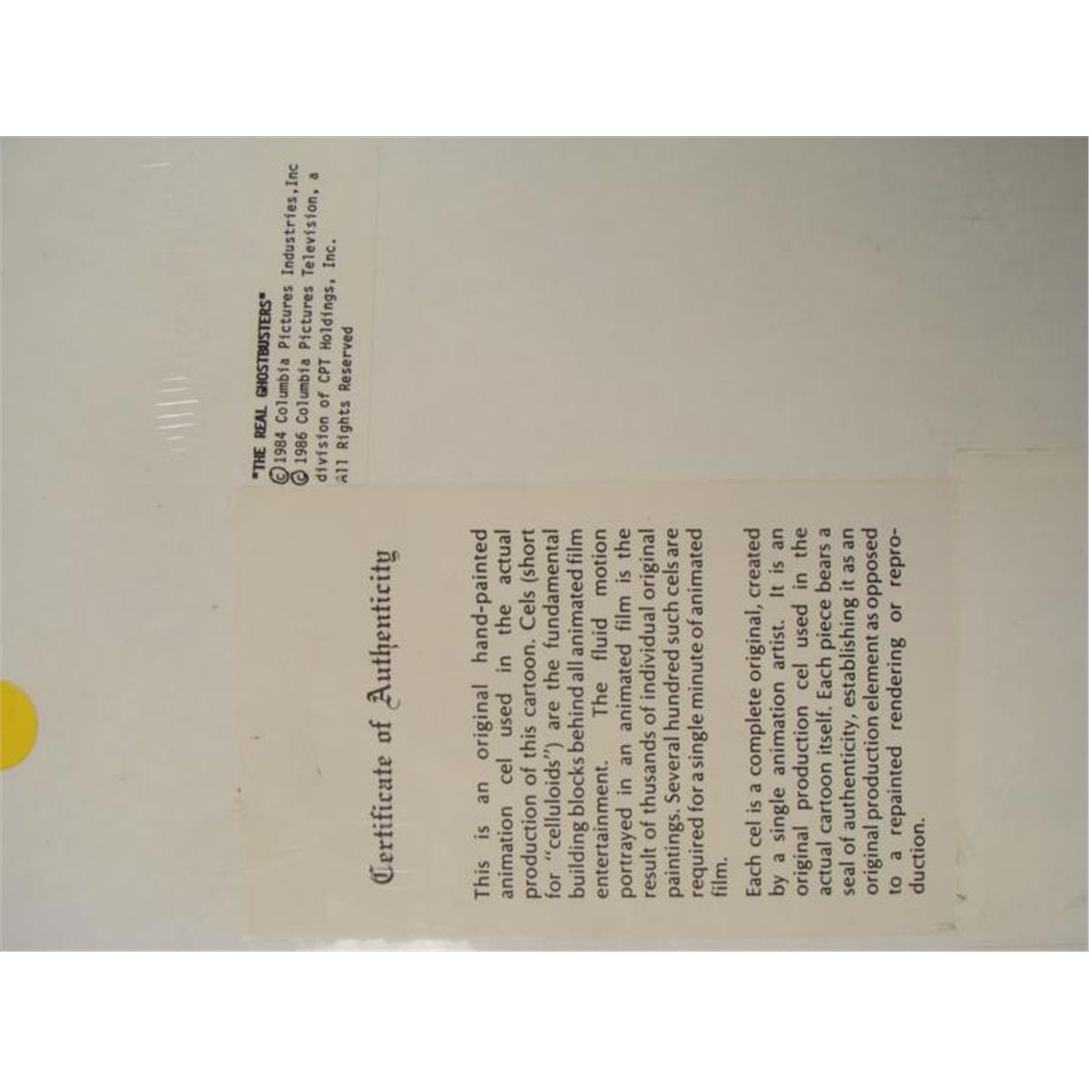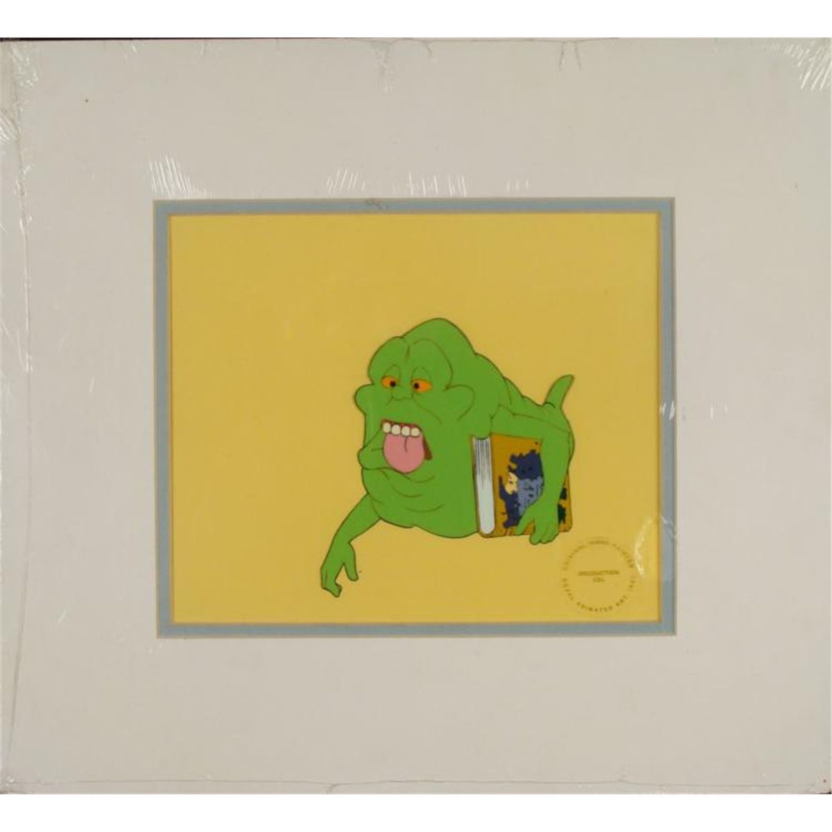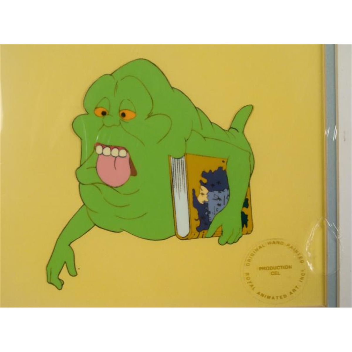 Here is an original animation cel used in the production of the 1980's cartoon The Real Ghost Busters. This is one of the most notorious phantoms, known as Slimer, and he appears to be checking out a book from the library. * Medium: Hand-inked and hand-painted acetate celImage size: 9 x 7 1/2 inches Presentation: Double matted in blue and whiteMatte size: 15 1/2 x 14 inchesCondition: Excellent; sealed in cellophaneCertificate of Authenticity: Included, with sticker on front