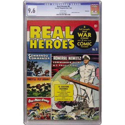 <B>Real Heroes Comics #8 Vancouver pedigree (Parents' Magazine Institute, 1943) CGC NM+ 9.6 White pages.</B></I> Highest-graded copy to date by far. Admiral Nimitz story. Overstreet 2007 NM- 9.2 value = $140. CGC census 6/07: 1 in 9.6, none higher.<BR><BR><b>Shipping:</b> Comics - Slabbed (certified) (<a target="_blank" href="http://www.heritageauctions.com/common/shipping.php">view shipping information</a>)