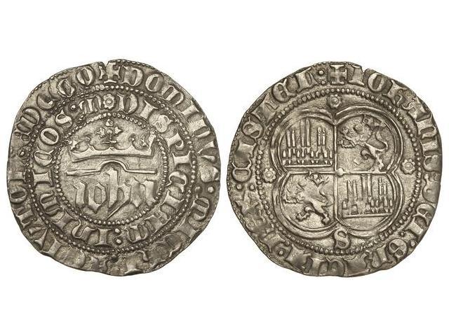 Real. JUAN I. SEVILLA. Anv.: ¶DOMINUS:MICHI:ADIVTOR:ET:EGO:DISPICIAM:INIMICOS:MEOS. IOHN coronado. Rev.: ¶IHOANIS:DEI:GRACIA:REX:CASTEL. Castillos y leones cuartelados, alrededor florones, debajo S. 3.41 grs. FAB-539.1. EBC-.</B