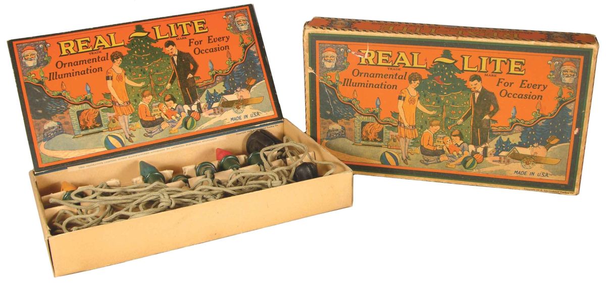 Real-Lite Ornamental Ilumination for every occasion, copyright 1928 International Trading Company. Corners of box lid broken away otherwise very good condition. 11 X 6 X 1 3/4 inches. Start Price $40
