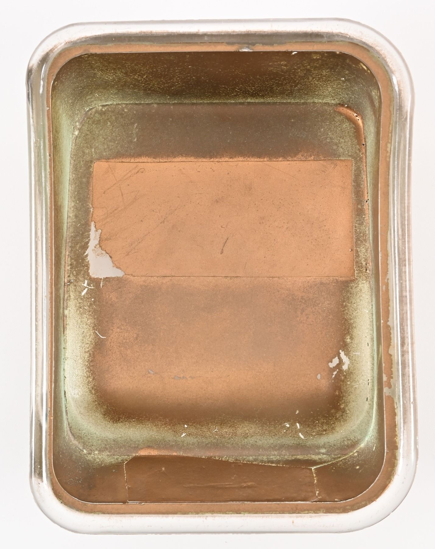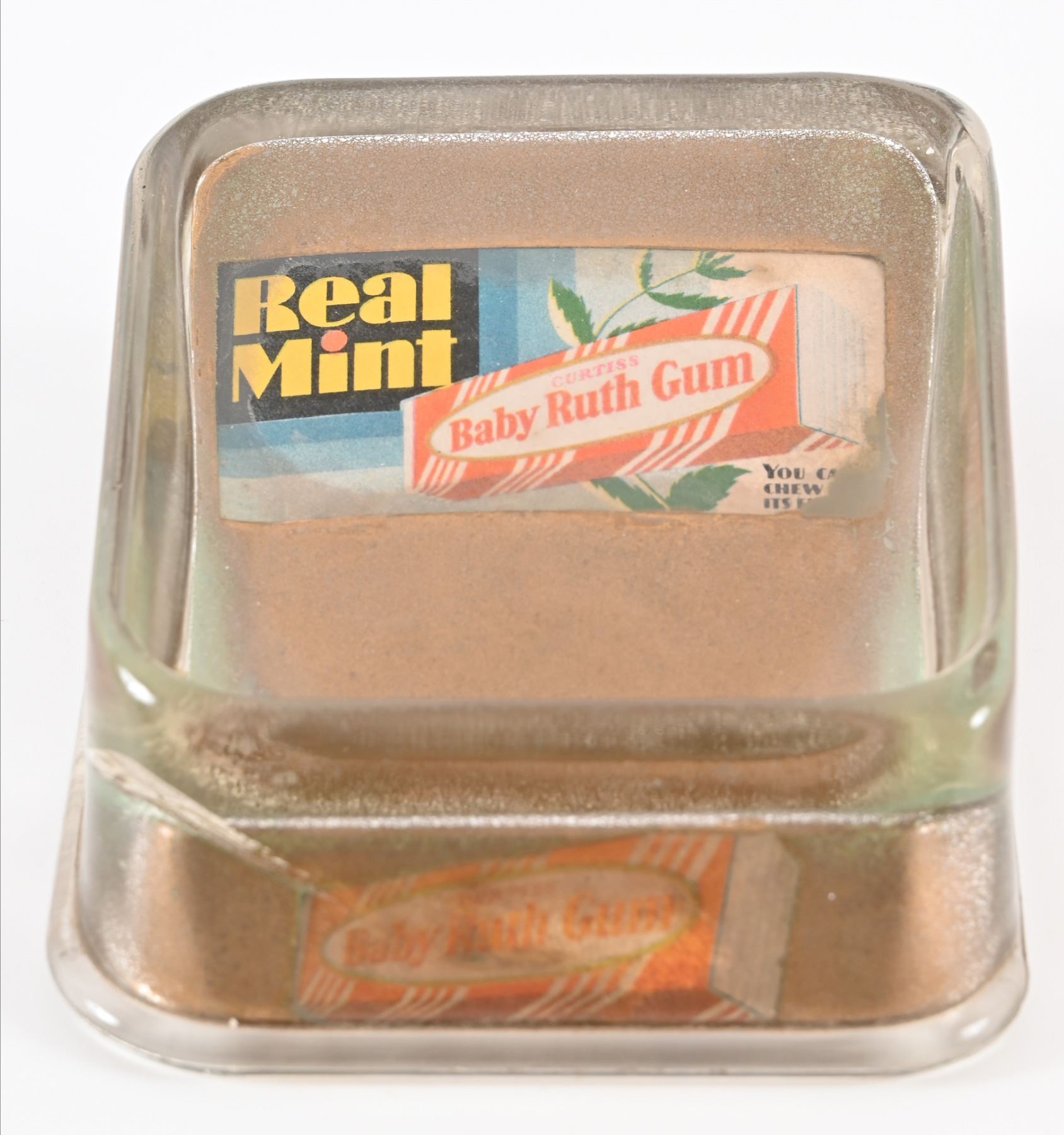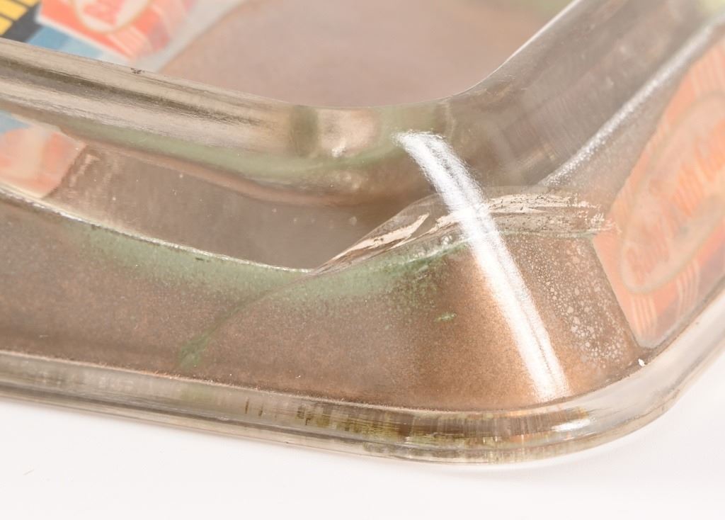 Vintage, glass, counter top advertising change tray. Measures 4 1/2" x 6 1/4" x 2".