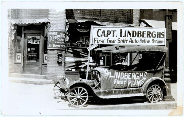 Real Photo Postcard. Nice view of an automobile with a sign “Capt. Lindbergh’s First Gear Shift Auto Motive Machine”. Painted on the side of the car is “Lindbergh’s First Plane”. Very light discoloration at lower right corner not affecting the photo. Unused. Clean back.