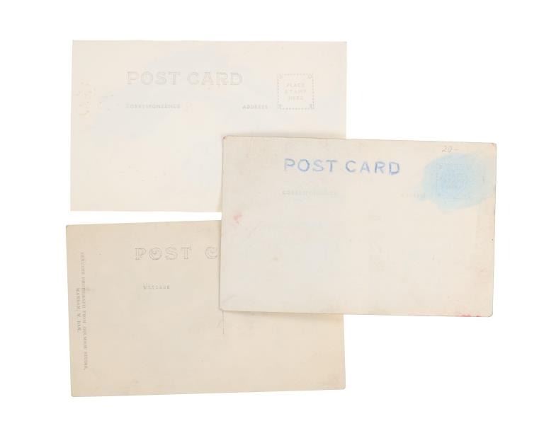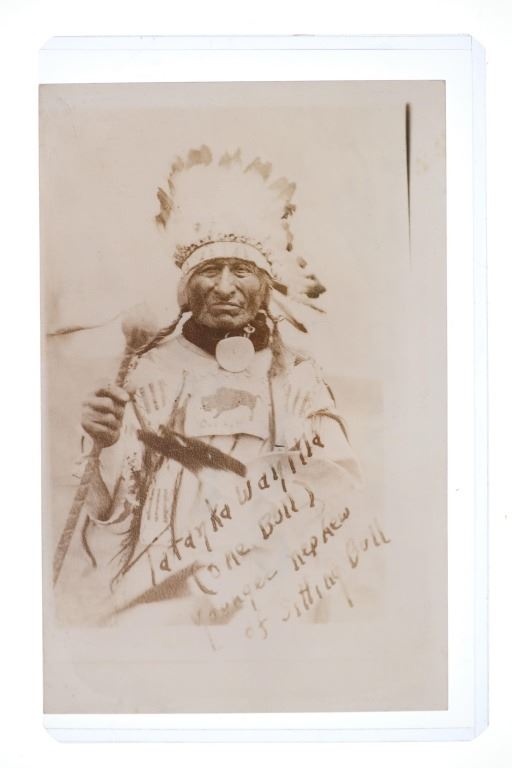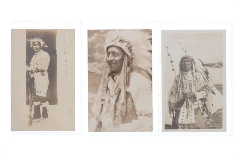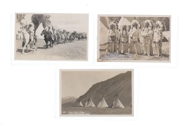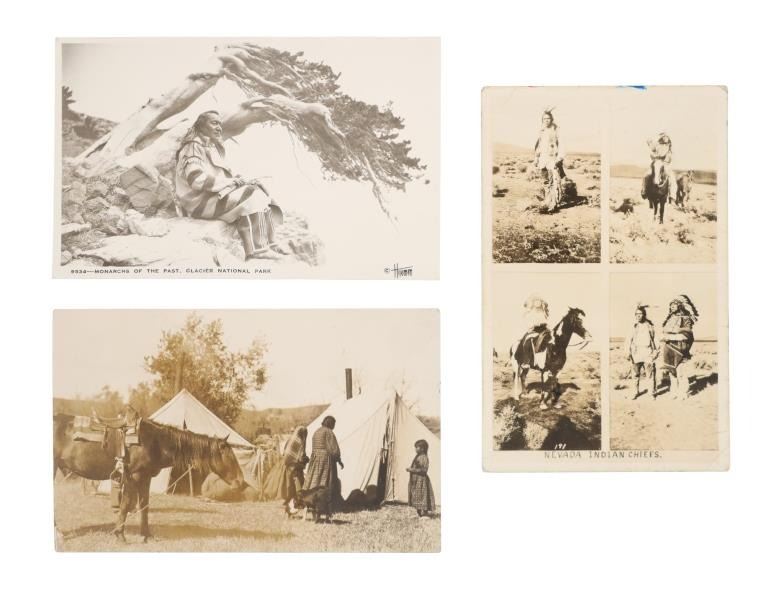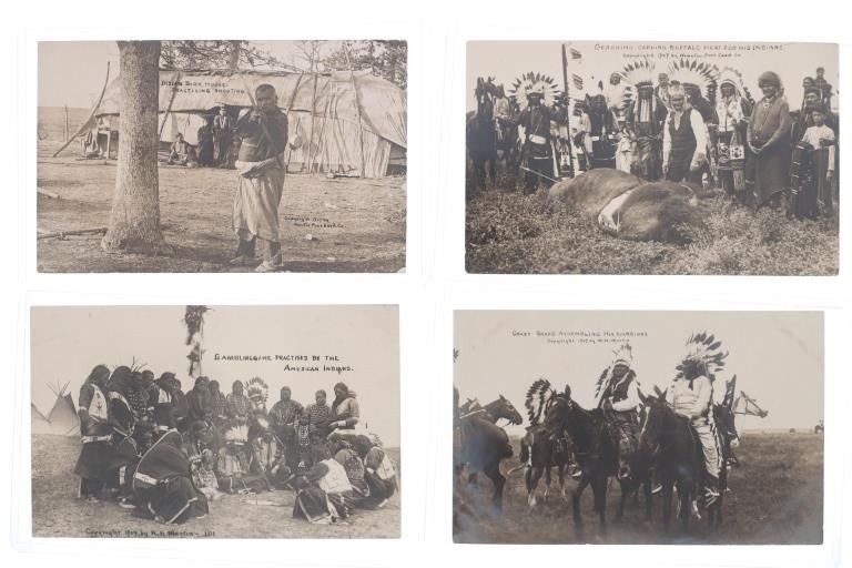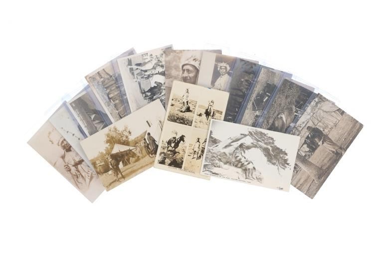 Featured in this lot are fourteen real photo postcards of Native Americans photographed in North Dakota and Montana Early / Mid 20th Century. The photos are published and copy-righted various photographers such as T. J. Hileman, Martin Post Card Company, W. H. Martin, KFR and Glacier Studio. The photos show Native life and Native Americans from different tribes doing various activities in their daily lives such as taking in the beauty of the surrounding areas, tending to their camps, riding their horses, posing for photos, skinning and carving a buffalo and practicing shooting their bow and arrows. The postcards show good condition overall with slight wear present from their age and handling over the years, but no major signs of damage is noted. A few have been written on. Eleven of the fourteen are set in a plastic slip case to preserve their condition. They measure 3 1/2" L x 5 3/8" W and have a collective weight of 8 ounces.