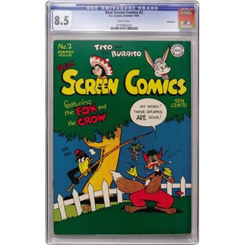 <B>Real Screen Comics #2 Vancouver pedigree (DC, 1945) CGC VF+ 8.5 White pages.</B></I> This was just the second comic book appearance of the Fox and the Crow, whose own series didn't start until later. From outside the slab this copy looks even nicer than the assigned grade... you be the judge! Overstreet 2007 VF 8.0 value = $293; VF/NM 9.0 value = $472. CGC census 6/07: 1 in 8.5, 1 higher.<BR><BR><b>Shipping:</b> Comics - Slabbed (certified) (<a target="_blank" href="http://www.heritageauctions.com/common/shipping.php">view shipping information</a>)