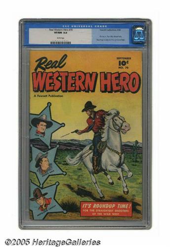 <B>Real Western Hero #70 (Fawcett, 1948) CGC VF/NM 9.0 White pages.</B></I> Overstreet considers this to be the first issue. Tom Mix, Monte Hale, Hopalong Cassidy and the Young Falcon begin. Overstreet 2005 VF/NM 9.0 value = $305; NM- 9.2 value = $400. CGC census 3/05: 2 in 9.0, none higher.