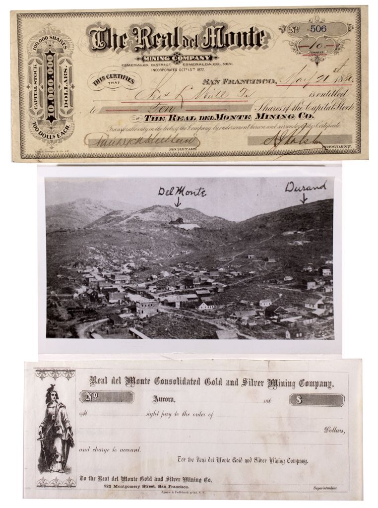 Lot of 3: 1) A 5" x 8" black and white bird`s eye view photo of the mine in relation to the town of Aurora. Excellent condition. 2) An unused check printed with the company`s head office address at 522 Montgomery St. San Francisco. Printed on onion skin stock, it has very slight fraying on some of the edge. 3) A stock certificate issued to (illegible) and signed by both the secretary and president (both illegible). It is for 10 shares at $100 per share and in excellent condition. - Maish Collection -58902