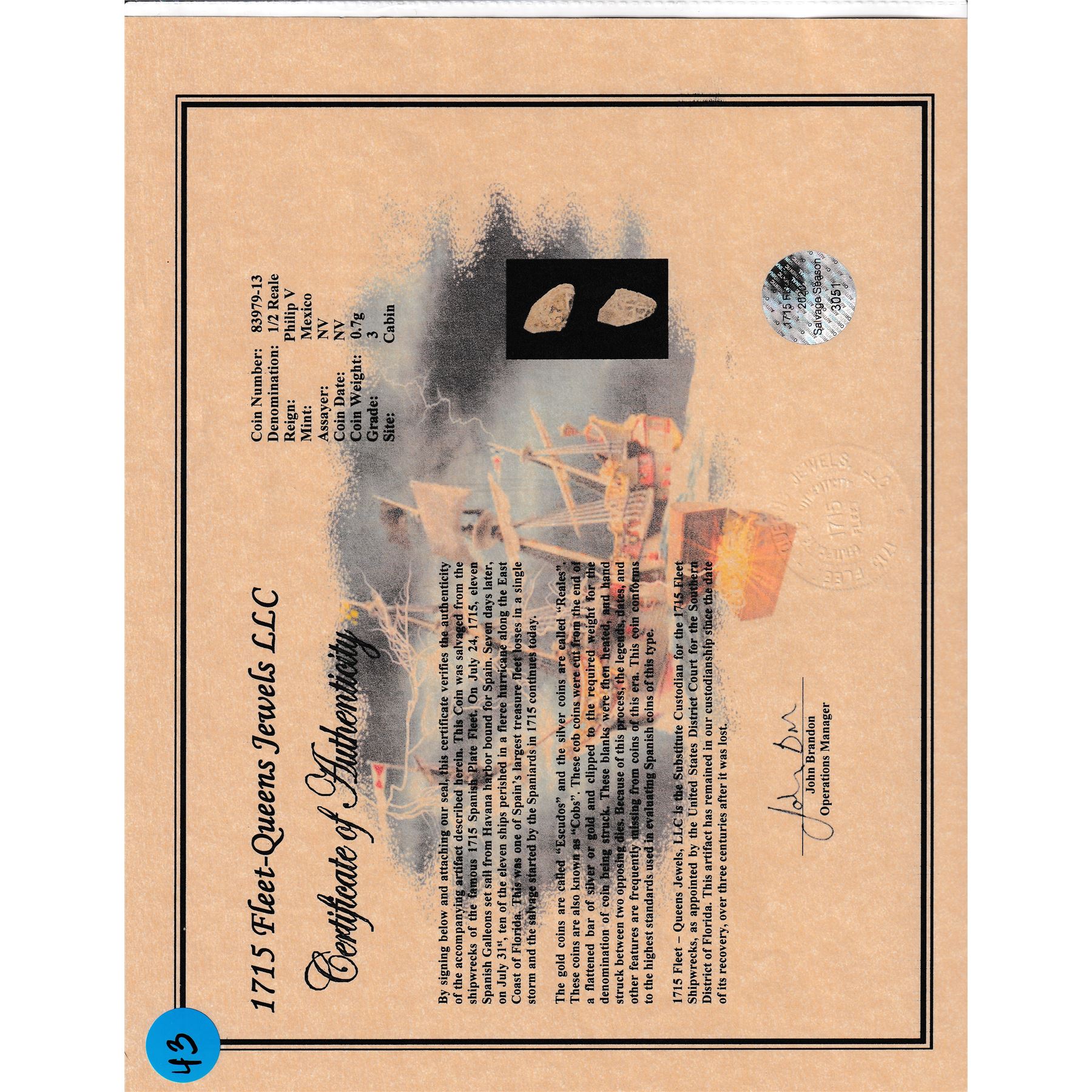 S/0.7-MOY TITLE DESCRIPTION: ½ Reale Certified Treasure Coin DESCRIPTION DETAIL: This coin was recovered by Queens Jewels at the Cabin wreck in the 2020 salvage season. This includes an original cert signed by John Brandon. Coin Number: 83979-13 Denomination: ½ Reale Reign: Philip V Mint: Mexico Assayer: NV Coin Date: NV Coin Weight: 0.7g Grade: 3 Site: Cabin PRIOR TO BIDDING READ THE DESCRIPTION, TERMS, AND CONDITIONS CAREFULLY This description and condition report is provided for your convenience based on the information provided by the consignor. CAA is not responsible for any discrepancies between this information and other opinions. Buyers Premium: 18% Payment Due in 5 days All items shipped to registered address - NO EXCEPTIONS S/0.7-MOY