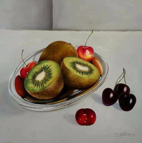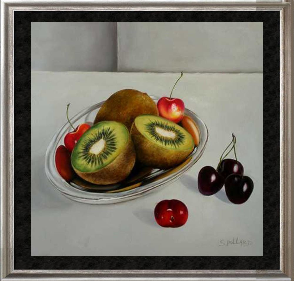 Scott Pollard | Title of Art: Kiwi & Cherries | Medium: Original Acrylic Painting Hand Signed by the Artist on Canvas | Unframed Size: 16 x 16 inches | Framed Size: Stretched | Value: $ 475 | ArtForSale.com