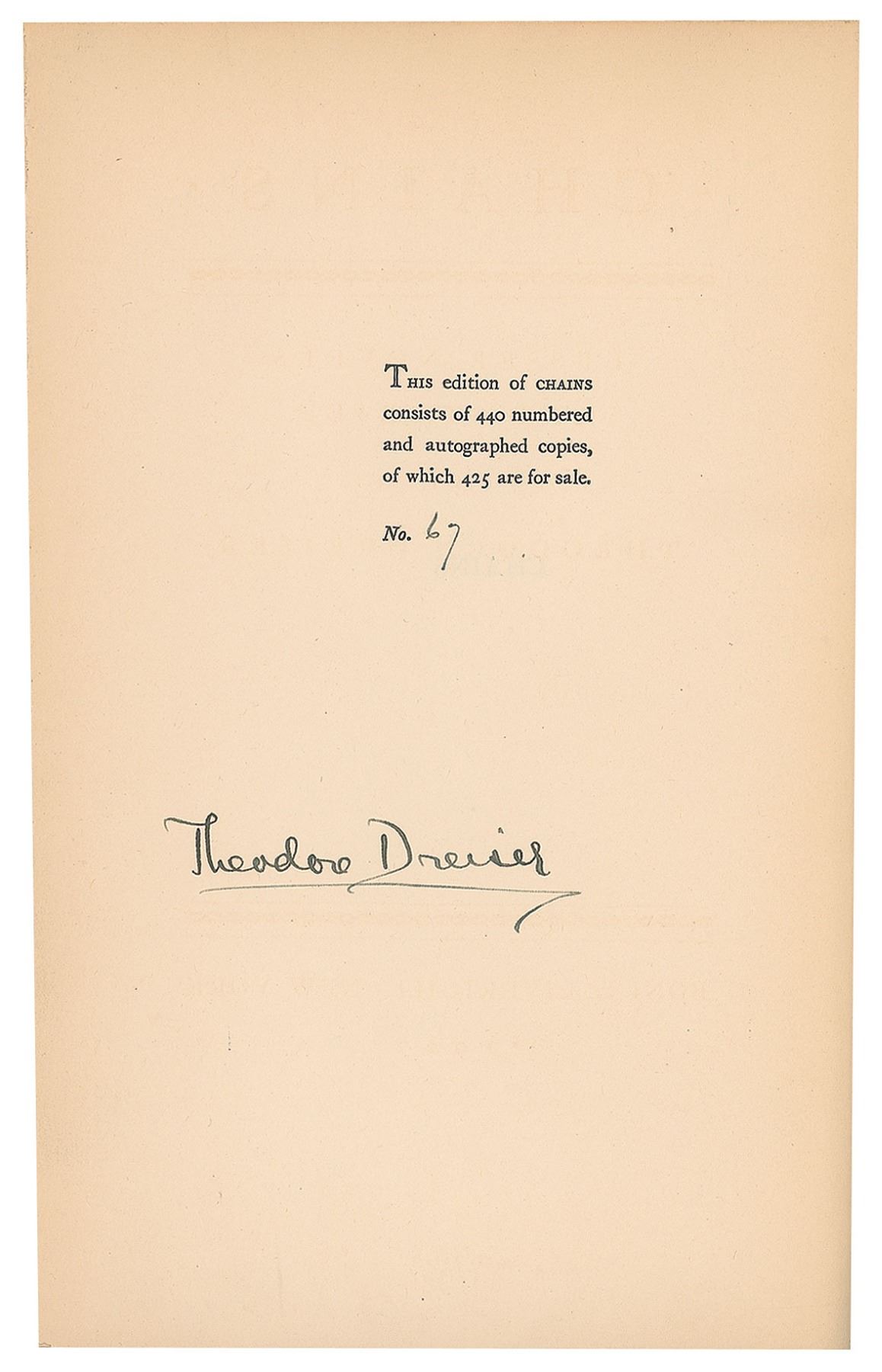 Three limited edition books signed by realist American novelists Theodore Dreiser, John O'Hara, and Irwin Shaw, including: Chains, published by Boni & Liveright in 1927, hardcover, numbered 67/440, signed on the colophon in fountain pen by Theodore Dresier; The Instrument, published by Random House in 1967, hardcover with slipcase, numbered 209/300, signed on the colophon in blue ballpoint by John O'Hara; and Bread Upon the Waters, published by Delacorte Press in 1981, hardcover with slipcase, numbered 300/500, signed on the colophon in black ballpoint by Irwin Shaw. In overall very good to fine condition.