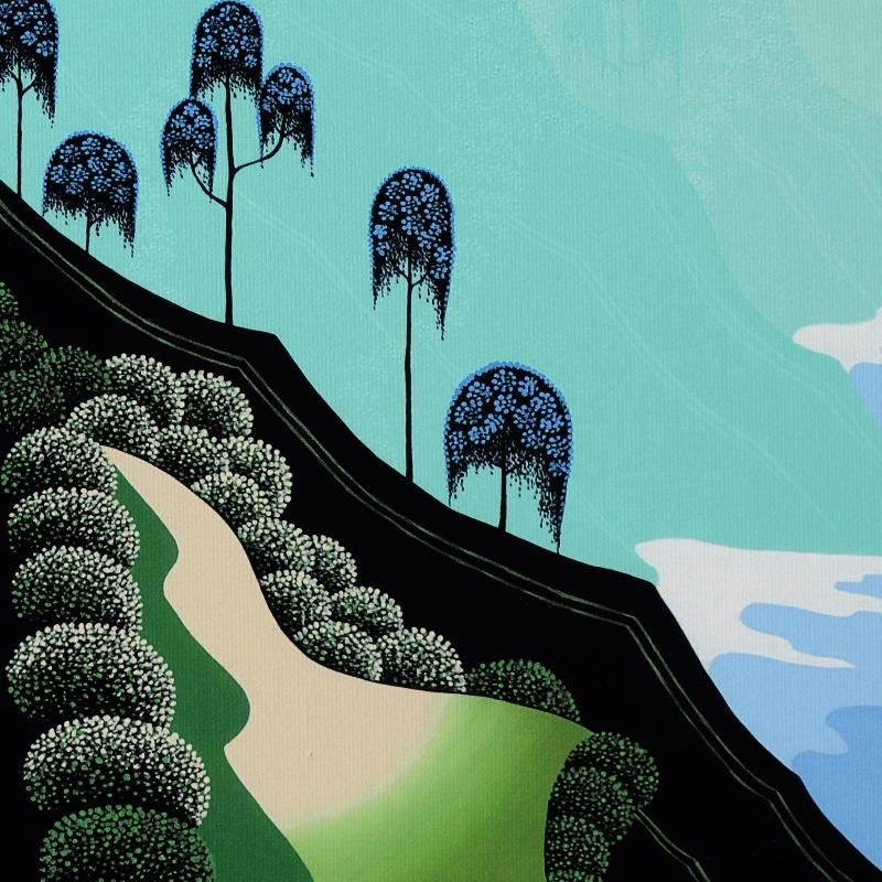 Larissa Holt, a student of distinguished artist Eyvind Earle(1916-2000), uses bold colors and breathtaking scenery to create images of Nature in her own unique style. "Reality Check" is a limited edition giclee on stretched canvas by Holt, numbered and bearing Holt's authorized signature. This piece comes gallery wrapped. Includes Certificate of Authenticity! Measures approx. 10" x 12.5" x 1.5" (image).