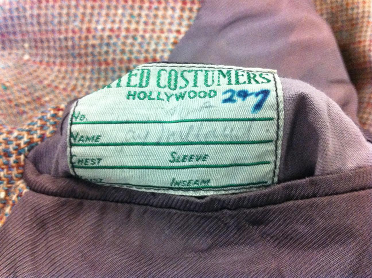 Ray Milland's production made worn coat from Reap the Wild Wind, which also starred John Wayne. This is a olive colored, three-button jacket. Western Costume label with his name and production number. Missing buttons on the front and worn on the inside)