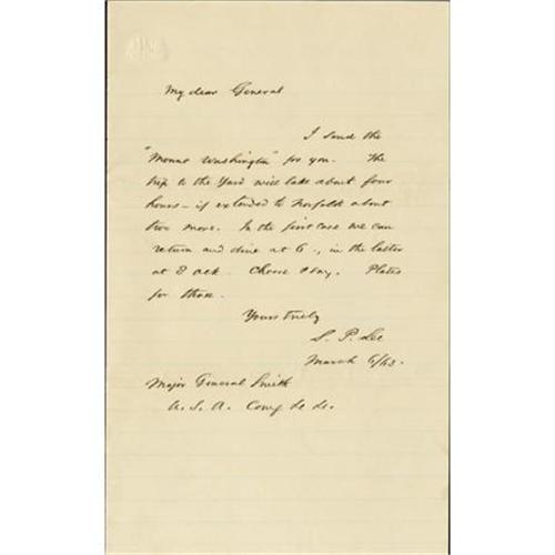 <B>Rear Admiral Samuel P. Lee Autograph Letter Signed</B></I>,<B> </B></I>“<I>S. P. Lee</B></I>”, one page, 5” x 8”, Virginia waters, March 6, 1863, to “<I>Major Genl. Smith, U.S.A.</B></I>”, Newport News, Virginia. The letter reads, “<I>I send the 'Mount Washington' for you. The trip to the yard will take about four hors - if extended to Norfolk about two more. In the first case we can return and dine at 6, in the latter at 8 o'clk. Choose & say. Plates for three.</B></I>” With original envelope imprinted U.S. Flagship “<I>Minnesota</B></I>”. Light toned paper, very fine condition.<BR>Samuel Lee, kin to Marse Robert, was a career naval officer who stayed true to the Union despite family roots deep in Virginia's aristocracy. The recipient of Lee's dinner invitation was William F. Smith, commanding the Ninth Army Corps.<BR><BR><b>Shipping:</b> Flat Material, Small (<a target="_blank" href="http://www.heritageauctions.com/common/shipping.php">view shipping information</a>)