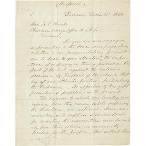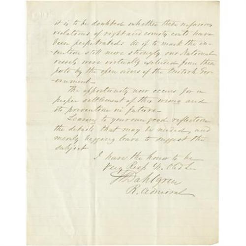 <B>Rear Admiral John Dahlgren Autograph Letter Signed</B></I> “<I>John A. Dahlgren</B></I>”. Two pages, 7.75” x 10”, Panama, December 13, 1866, to Congressman N. P. Banks. This letter provides an interesting insight on post-Civil War relations with England. Dahlgren writes to Banks, who at the time was Chairman of Foreign Affairs: “<I>As you are now engaged in presenting to the House some propositions relative to our foreign relations, permit me to draw your attention to the importance of including in them a protest on the part of the U.S. against the continued possession of England of the islands that lay off our Atlantic frontier - particularly the Bahamas…The injuries to which our Country was exposed from this cause, while suppressing the Rebellion, are notorious- Arms, ammunition and supplies of various kinds for maintaining the insurrection were furnished from these islands…The opportunity now occurs for a proper settlement of this wrong and its prevention in future…</B></I>”. John Adolphus Bernard Dahlgren headed the Union navy's ordnance department and was responsible for several armament designs. A crisp letter, with the usual fold creases, else fine. <I>From the collection of Henry E. Luhrs.</B></I><BR><BR><b>Shipping:</b> Flat Material, Small (<a target="_blank" href="http://www.heritageauctions.com/common/shipping.php">view shipping information</a>)
