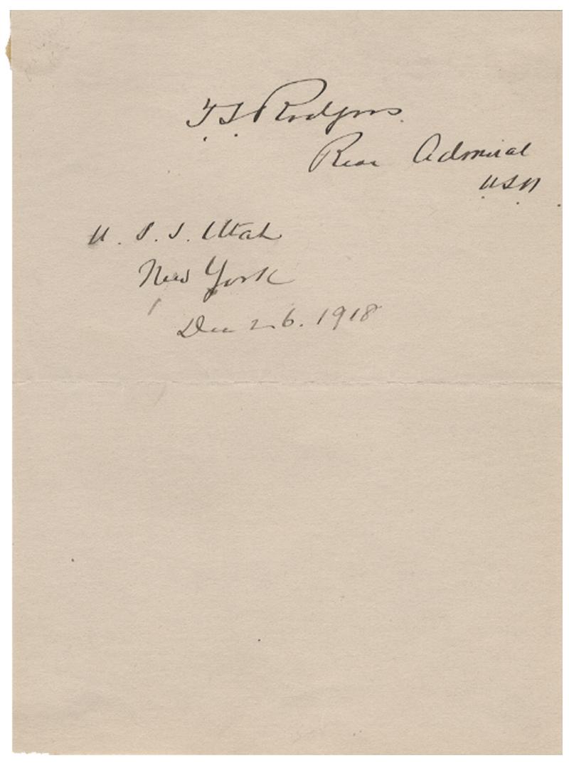 Thomas Slidell Rogers (1858 – 1931). Naval Officer arising to the rank of Rear Admiral. Signed sheet “T. S. Rodgers, Rear Admiral, U.S.N.” Below, he has added “U. S. S. Utah, New York, Dec. 26, 1918.” Center fold. Fine.
