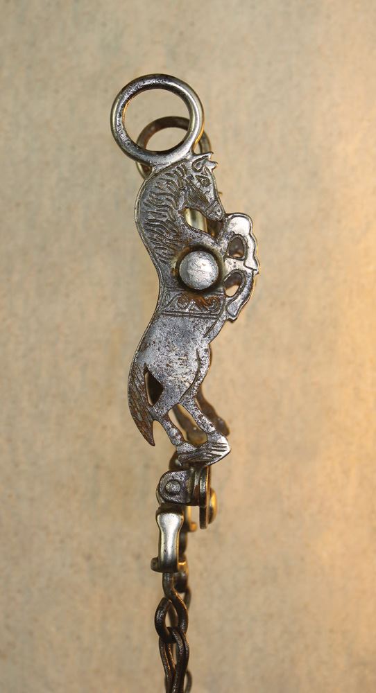 Classic North and Judd rearing horse bit, with deep engraving, traces of nickel finish and great original rein chains.