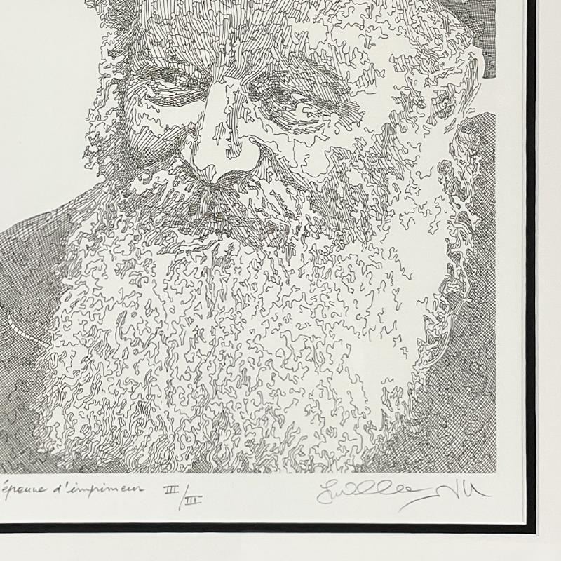 "Rebbe" is a limited edition etching on paper by Guillaume Azoulay, numbered III/III and hand signed by the artist. This piece comes custom framed. Includes Letter of Authenticity. Measures approx. 22" x 27.5" (frame), 10.5" x 16" (image).