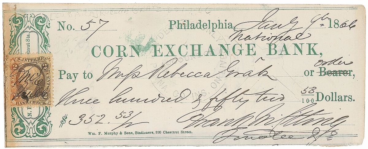 Jewish American educator and philanthropist (1781–1869). Corn Exchange Bank check, 6.75 x 2.5, filled out in another hand, payable to Rebecca Gratz for $352.53, January 9, 1866, endorsed on the reverse in black ink by Gratz. In very good to fine condition, with show-through from tape remnants to reverse.
