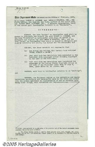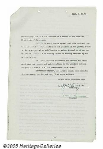 <B>"Rebel Without a Cause" Archive.</B></I> Director Nicholas Ray's landmark 1955 juvenile-delinquent drama dared to take a an objective look at the seemingly halcyon days of the '50s, and in the process became an American classic boasting a remarkable cast led by Natalie Wood, Sal Mineo, and James Dean in only his third and final role (he died before the movie's release). Featured here is a collection of documents pertaining to the production of the film, including contracts adaptation rights for the original book by Irving Shulman, and for the film score signed by composer Leonard Rosenman. All are in very good condition with the usual staple and binder holes, with little to moderate tanning or creasing. <I>With COA from PSA/DNA.</B></I>