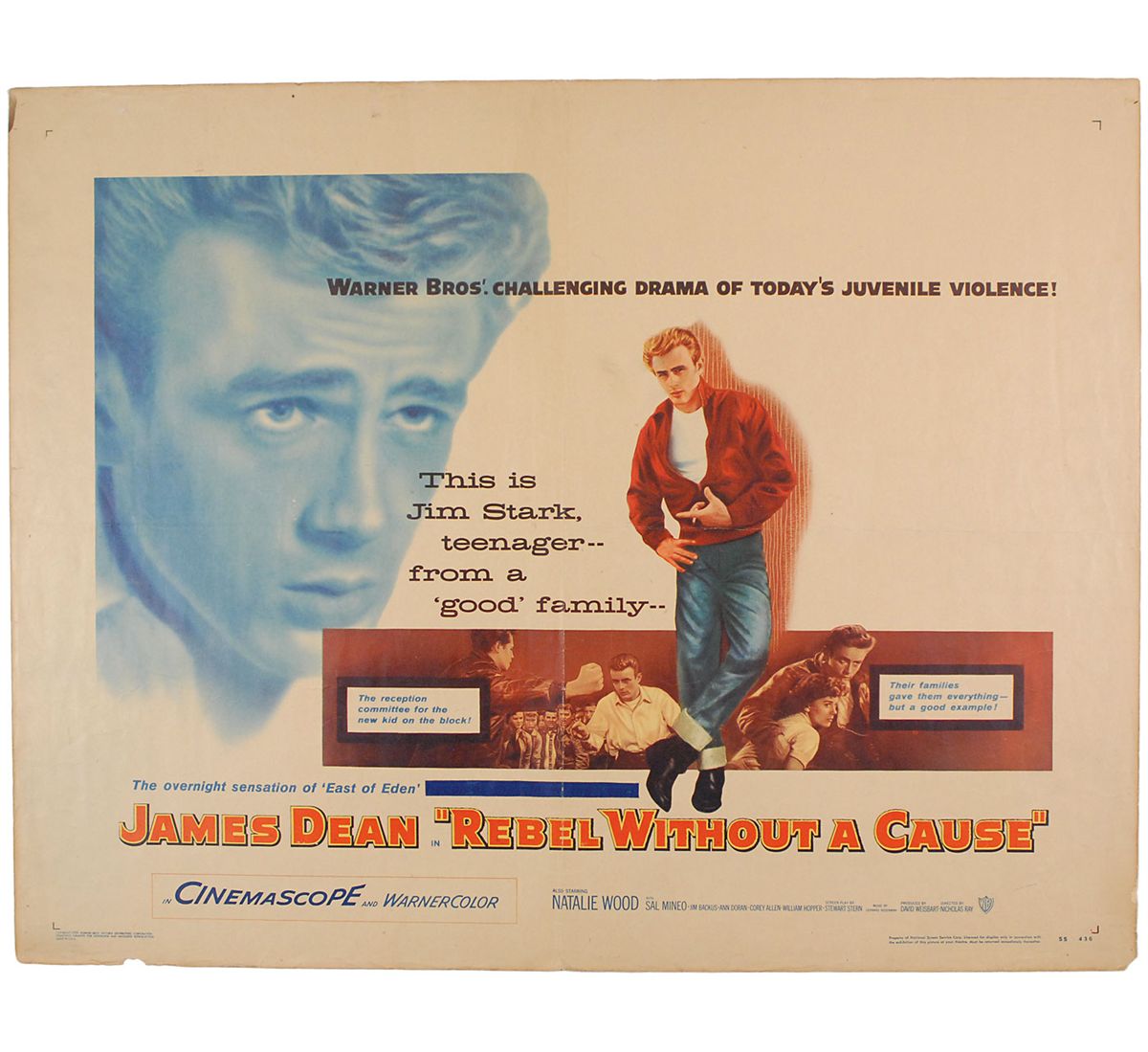 Vibrant original color 28 x 22 half-sheet movie poster for the iconic 1955 Warner Bros. film Rebel Without a Cause, starring James Dean in his classic role as the troubled teenager Jim Stark. A central vertical fold, scattered creases, and some small edge and corner chips, otherwise fine condition. A wonderful poster with bright, bold colors, and an image handsomely capturing the essence of Dean’s phenomenal performance.