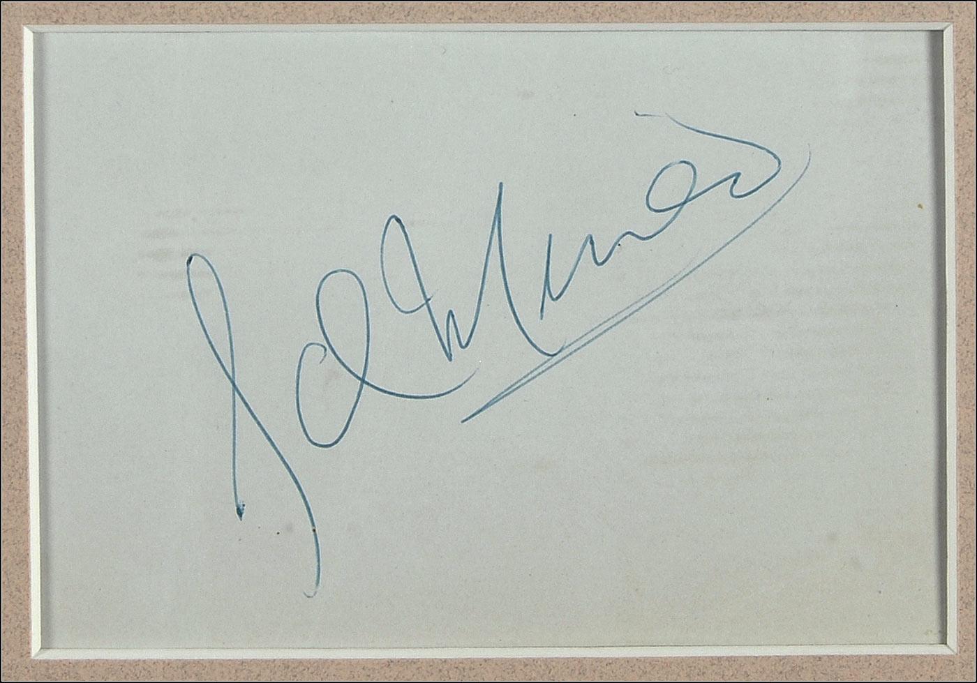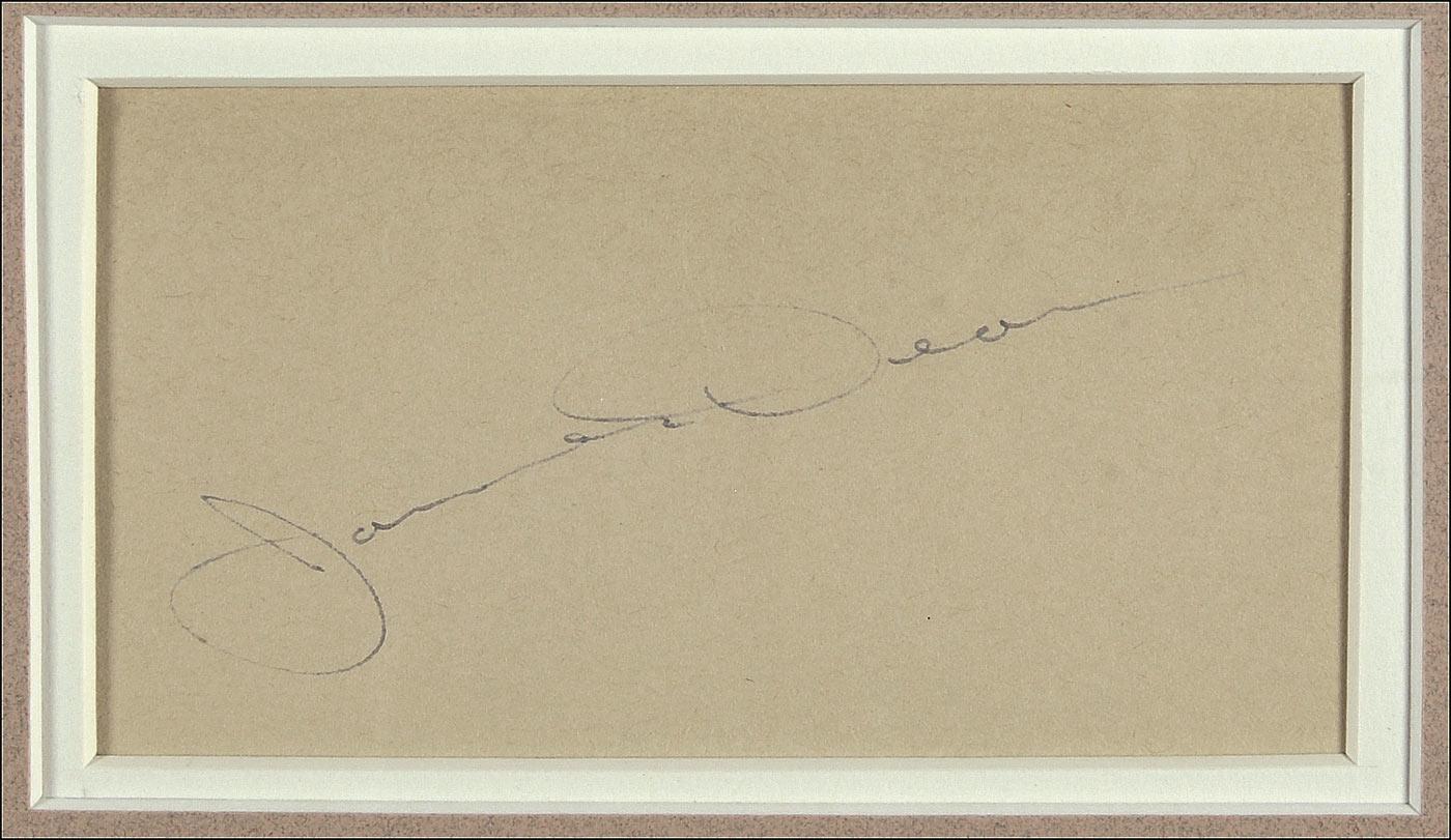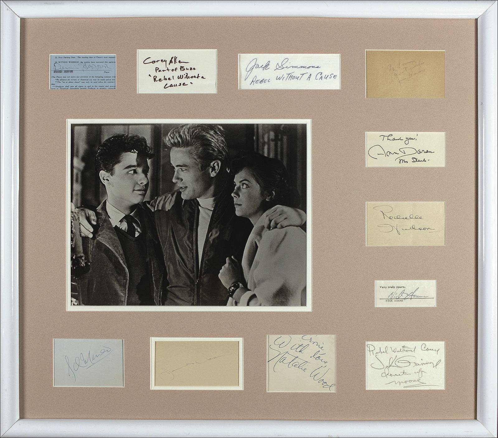 Various ink signatures of James Dean, Natalie Wood, Sal Mineo, Nick Adams, Corey Allen, Jim Backus, Ann Doran, Jack Grinnage, Dennis Hopper, Rochelle Hudson, and Jack Simmons, on individual slips, cards, or clipped documents. All are doubled matted and framed with a photo of Dean, Mineo, and Wood to an overall size of 28.5 x 25.5. Accompanied by individual loose ink signatures of Ed Platt, House Peters, Jr., and Ian Wolfe on an album page, slip, or card. In overall fine condition. A difficult set to assemble and a most impressive display. Oversized. Pre-certified PSA/DNA and RRAuction COA.