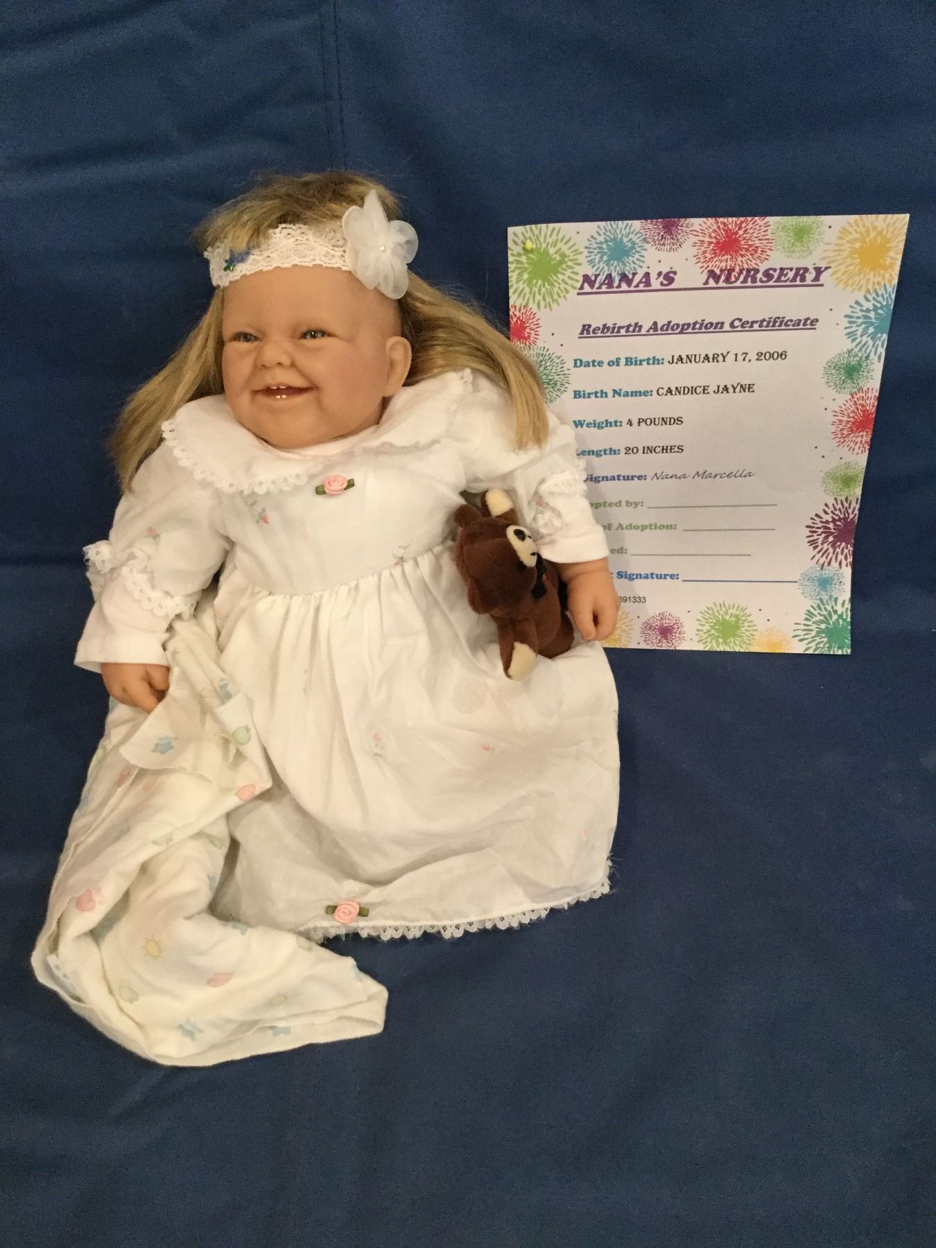 Berenguer Doll reborn into beautiful baby girl. She has her weighted in limbs and head Her body filled with Glued on quality wig. Born January 17, 2006, Weighing 4 lbsand 20" long Waiting to be adopted. Comes with a certificate