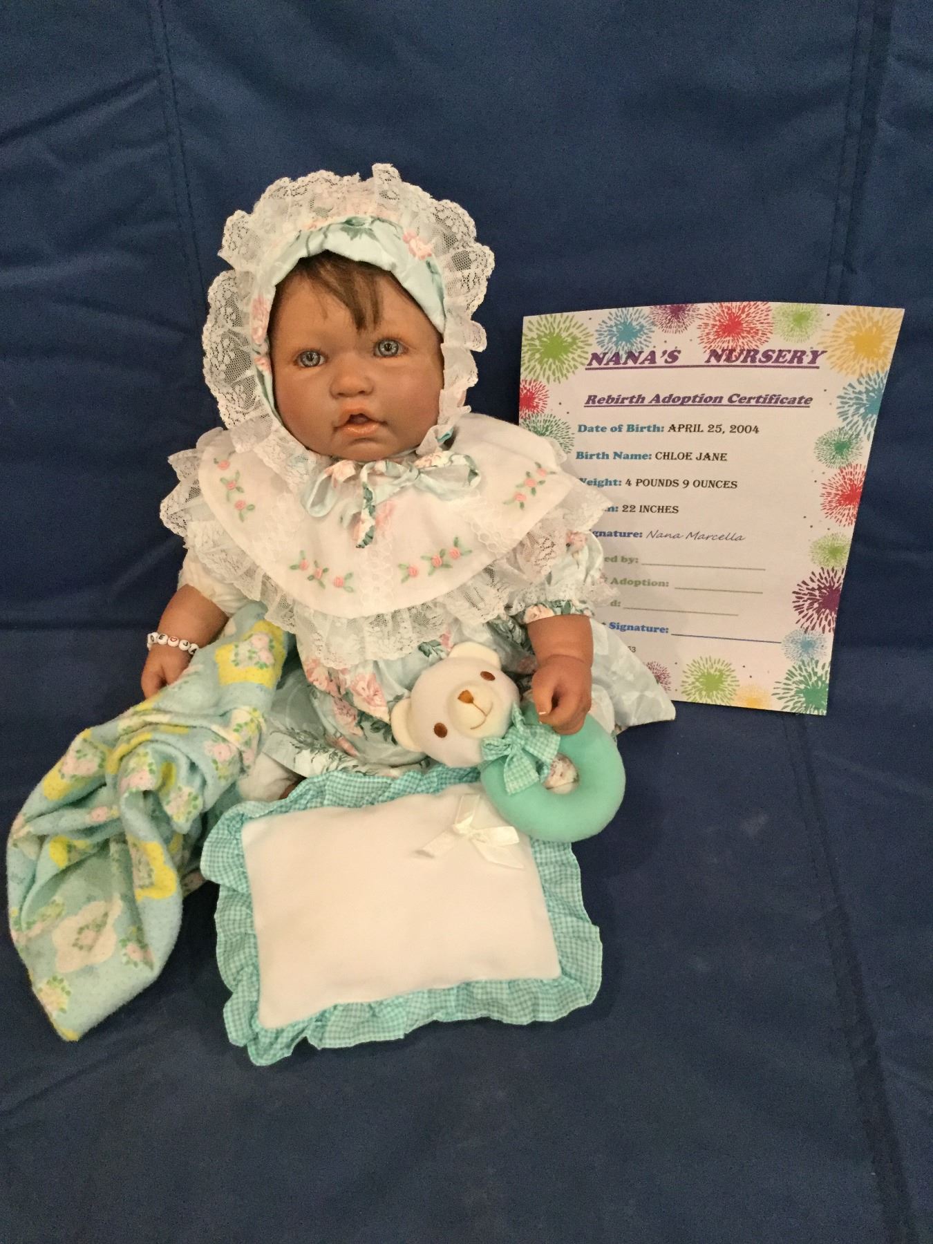 Berenguer Doll reborn into beautiful baby girl. She has her weighted in limbs and head Her body filled with Glued on quality wig. Born April 25, 2004, Weighing 4 lbs 9oz and 22" long Waiting to be adopted. Comes with a certificate