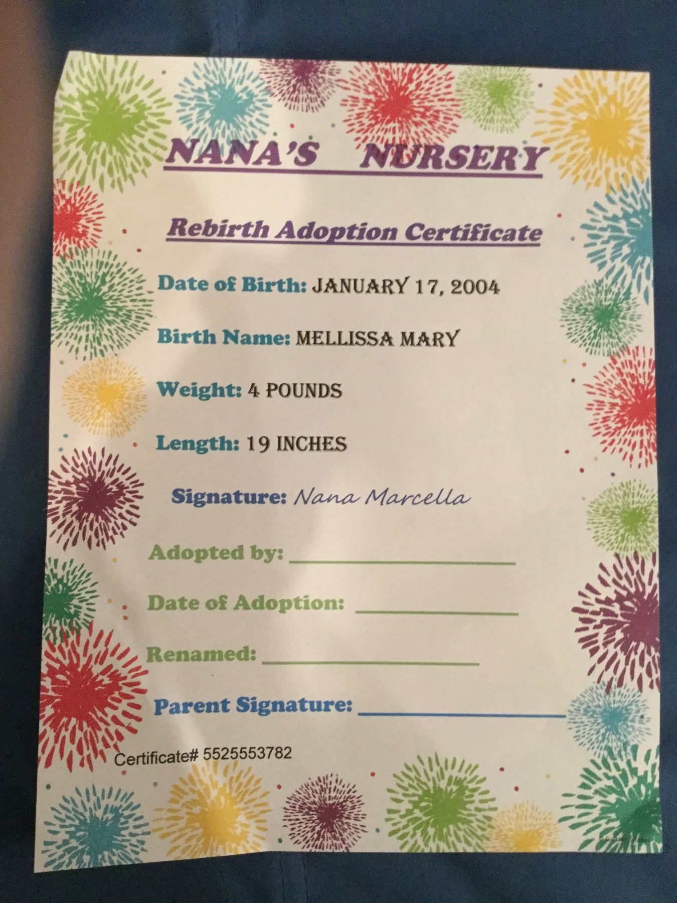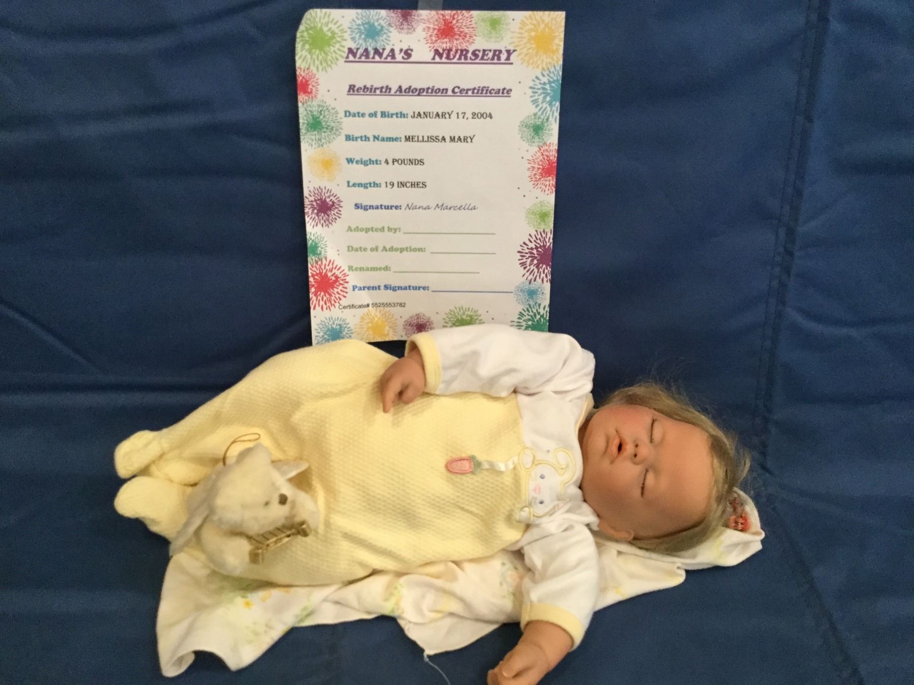 She started off as a Berenguer sleeping baby. Stripped of all factory paint, Sanitized and then repainted and blushed. Her new cloth body was filled, weighted and sealed. Head & Limbs also done to make her feel more like a new baby. Her Nose and mouth have been opened and then backed so they are sealed Was Born on January 17, 2004 weight 4 lbs. and 19 ". She needs a home Adoption Certificate included