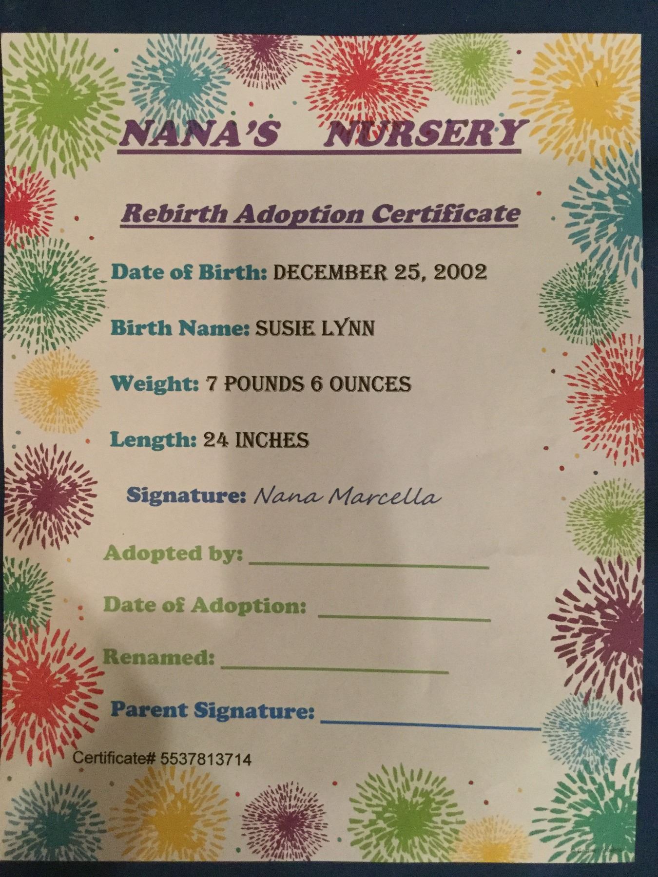 Berenguer play doll reborn into beautiful baby girl. She has her weighted in limbs and head with sterile sand and poly fill and sealed. Her body filled with sealed sterile sand and soft polly fill. Nose opened and Ears pierced. Glued on quality wig. Born September 25, 2002; 7 lbs. 6 oz and 24" long Waiting to be adopted. Comes with a certificate