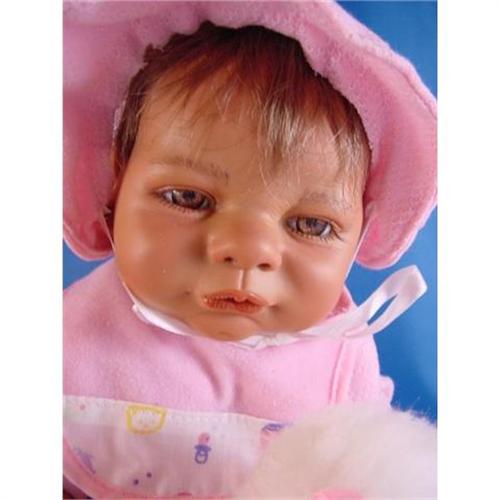 Reborned 14in Cititoy Baby Doll, Excellent. She has beautiful brown eyes with eyelashes, and brown hair. Her ears are pierced with golden earrings and she is dressed in a pink jumpsuit with matching hat. She comes with her toy plush white poodle and pink kitty blankie. A very sweet babydoll!