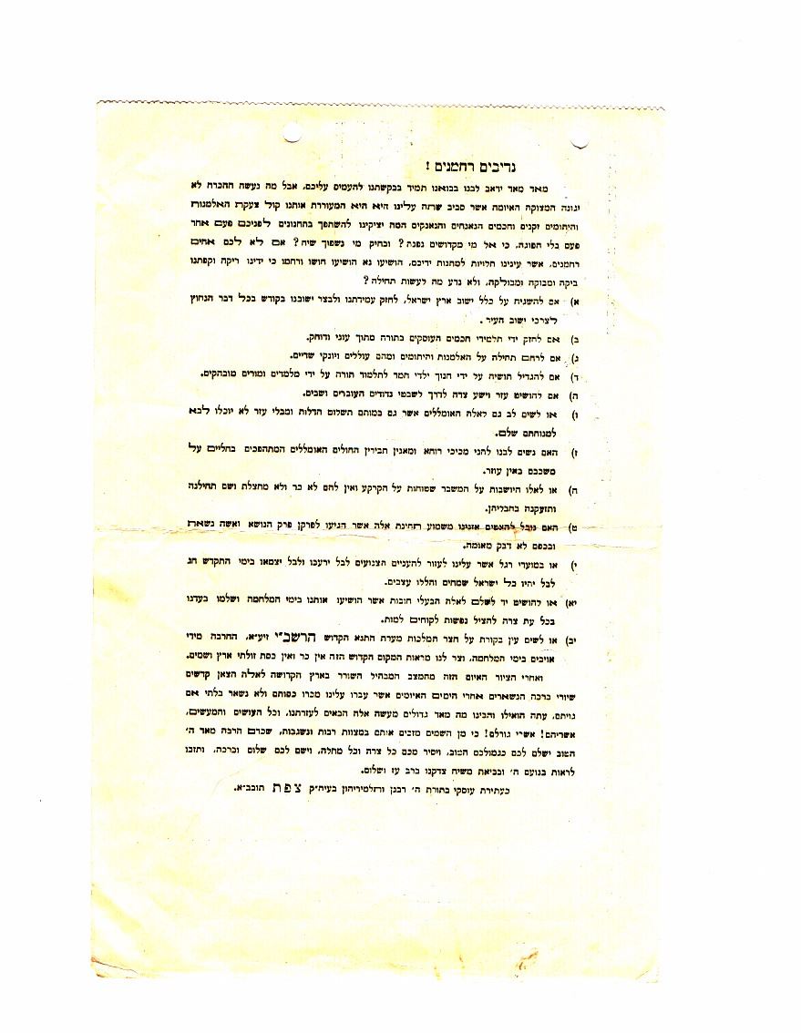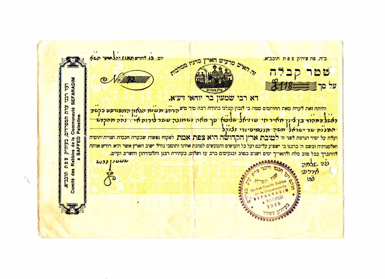 Receipt of the Council of Rabbis and Elders of the city of Safed, for a donation from Chief Rabbi Uziel, the donation was granted by Minister Moshe Montefiore, 26 Tamuz 1948. Printed and filled out in handwritting, including date, with the Rabbi Council stamp. Good condition: two punch holes. Dimensions: 24.5x16 cm.