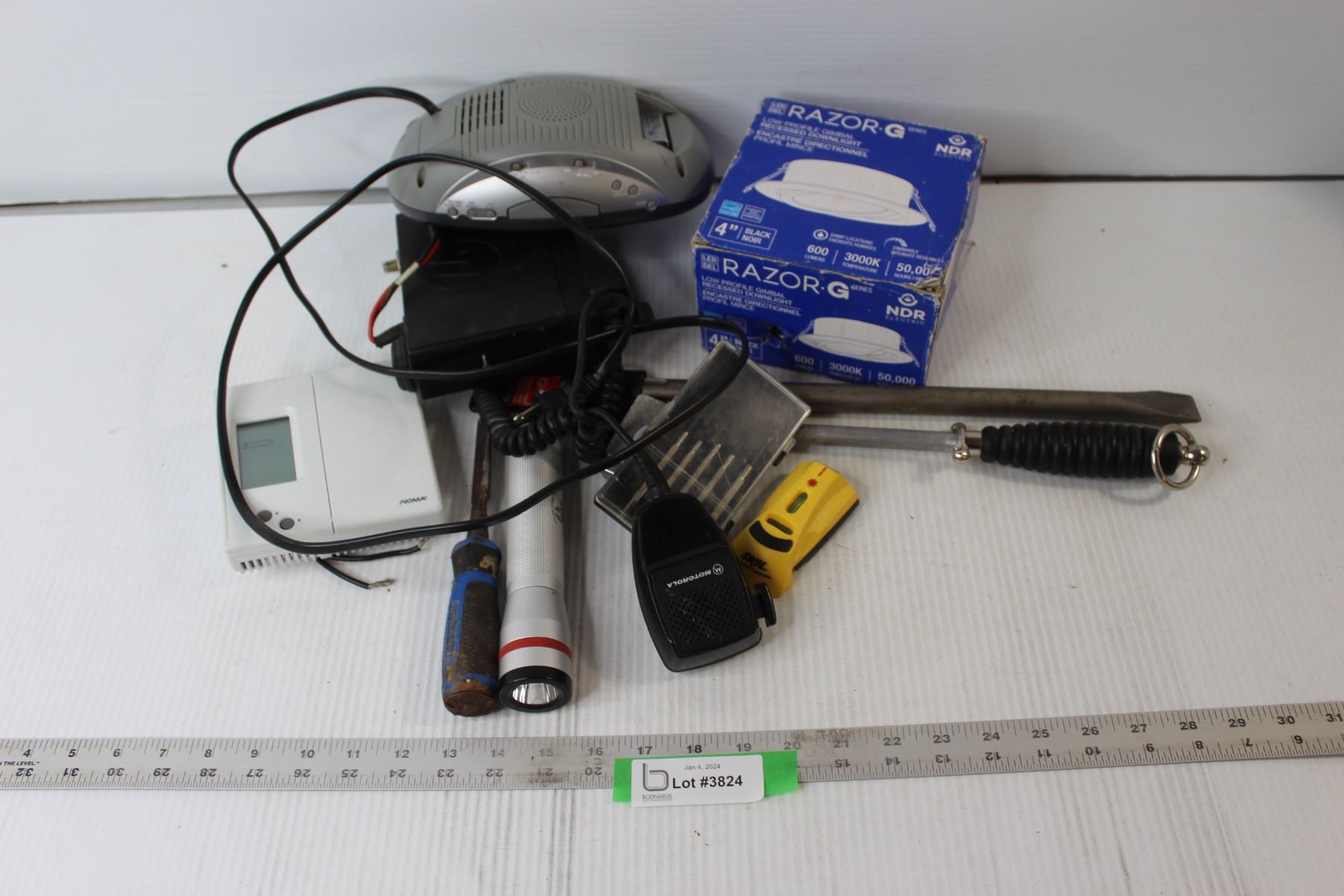 Recessed Downlight, Flashlight, Radio Alarm - Working, Noma Programmable Thermostat, Motorola Radio, Tools, etc.