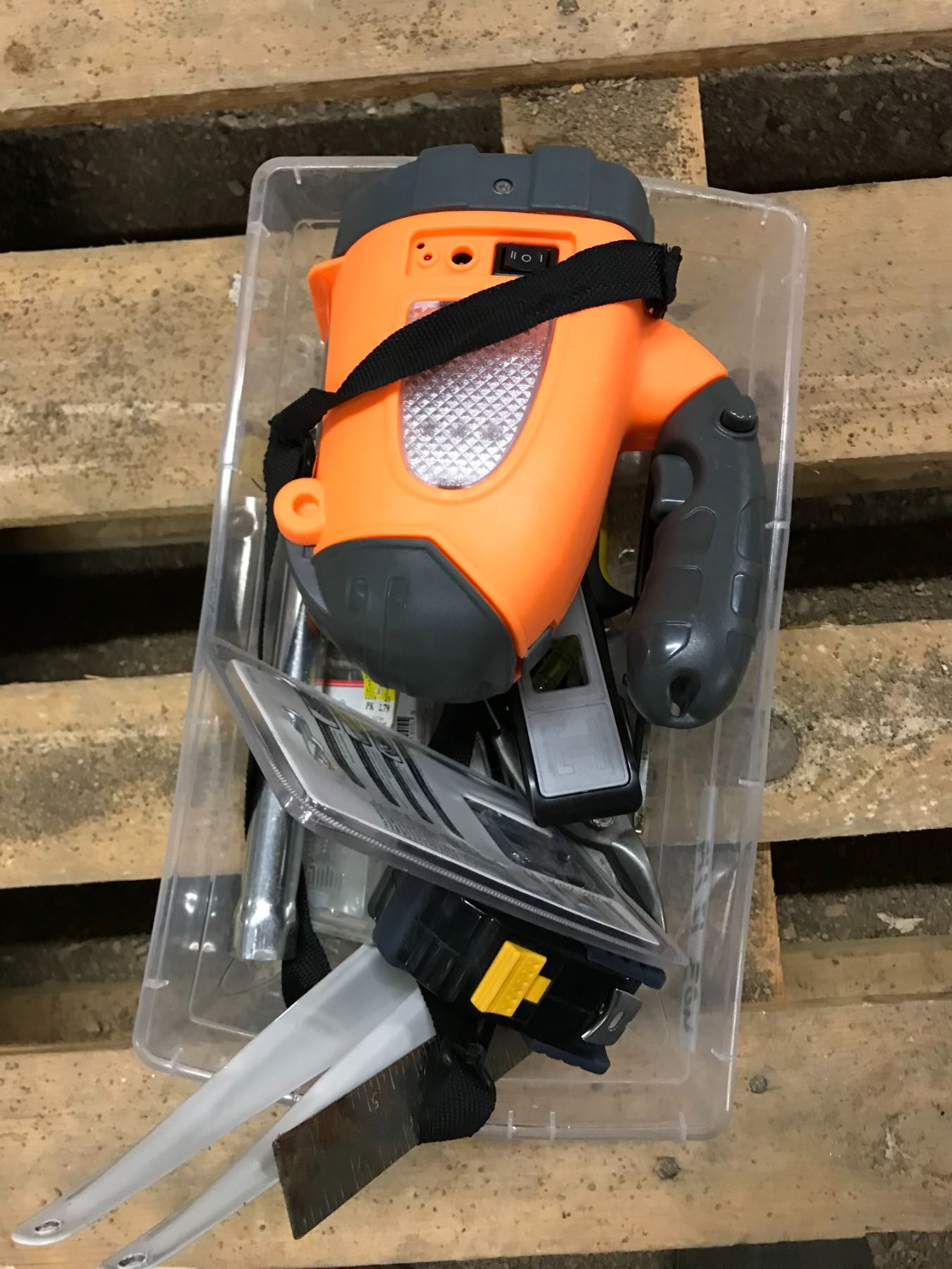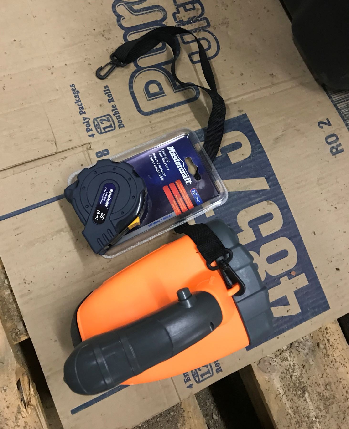 Rechargeable Spotlight, Tape Measure, Assorted Hardware