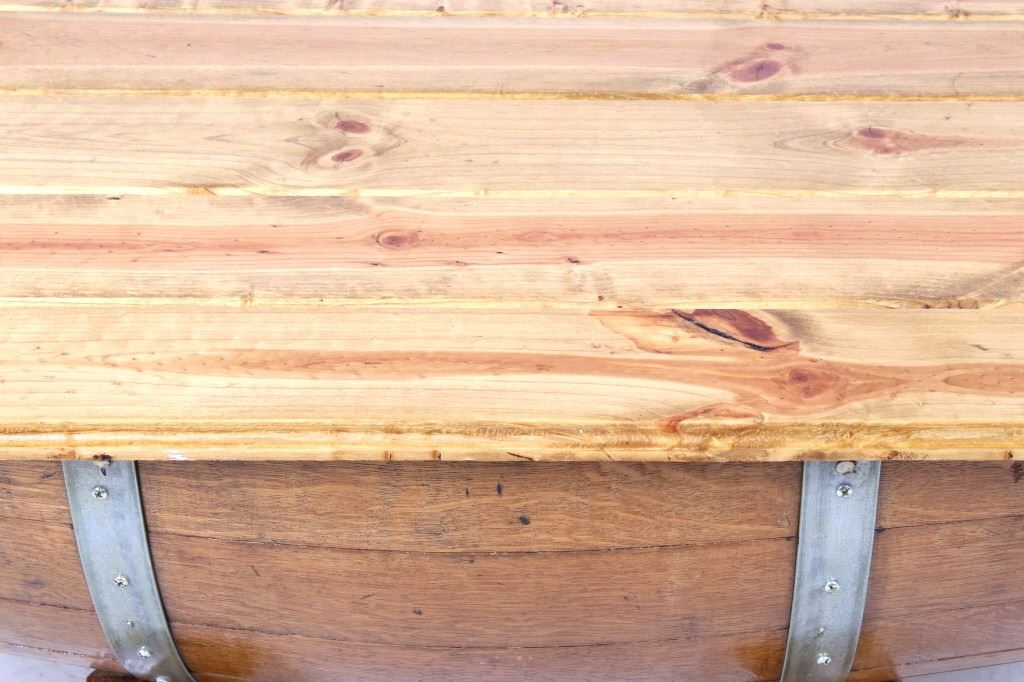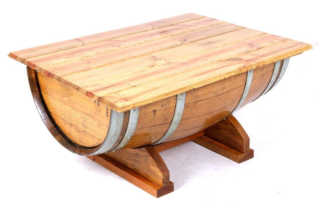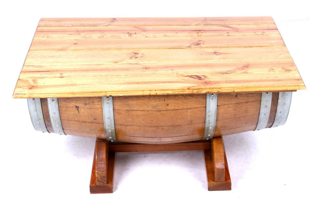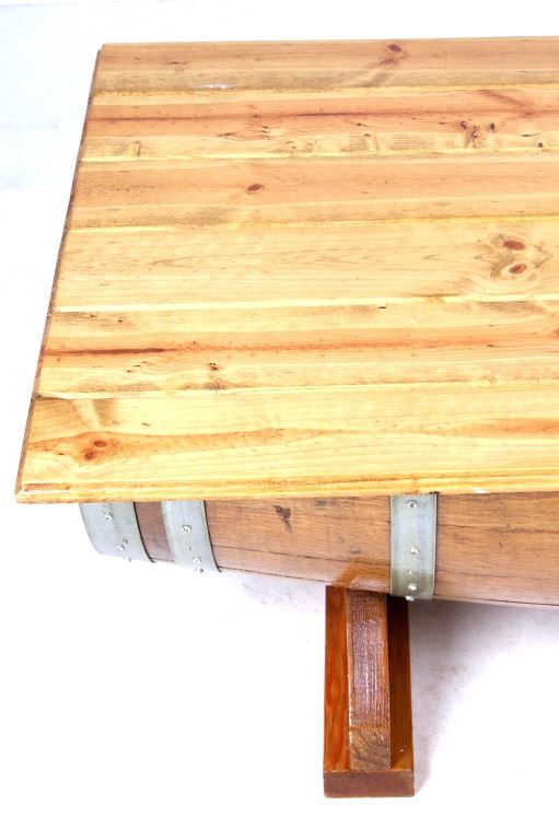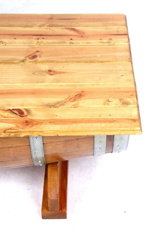 For your consideration is this reclaimed whiskey barrel coffee table. This would make a great addition to a living room sporting a stylish steel banded whiskey barrel cut in half and beneath a stained pine wood top. With undercut feet made from oak. The measurements of this table are 18 3/4" x 39 1/4" x 29 1/4".