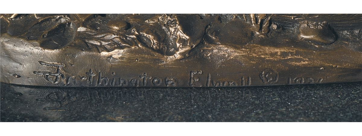 This is a heavy bronze casting of a reclining buffalo by Robert Farthington Elwell (Am: 1874-1962). This bronze is dated 1936, has a cast signature on the base and bears a copyright mark. Rests on a black marble plinth and measures 10 inches tall x 16 inches long x 9 inches wide. Weighs 66 pounds.