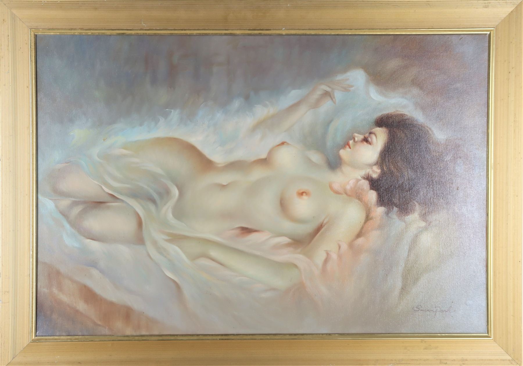 Female reclining nude, oil on canvas, signed upper right: Susan Park.